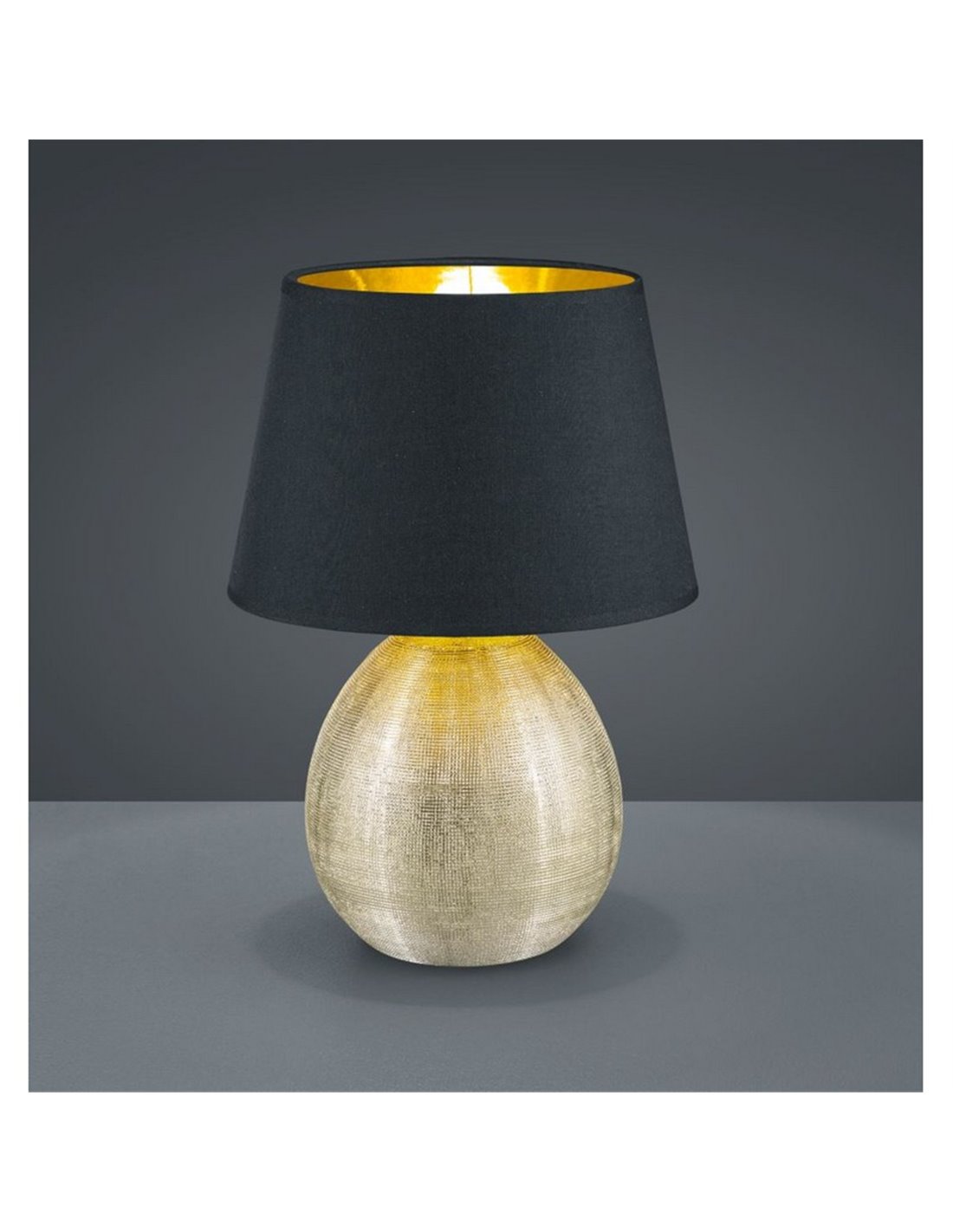 Die Gold-Lampe LUXOR ist dafür konzipiert, Salon, Flur oder Schlafzimmer zu verschönern. Der Kontrast zwischen der metallischen Oberfläche und dem dunklen Schirm sorgt für eine moderne Präsenz mit einem Hauch von Luxus. Mit einer Höhe von 35 cm und einem Durchmesser von 24 cm ist sie perfekt als Beistelllampe für Tische, Sideboards oder Nachttische.