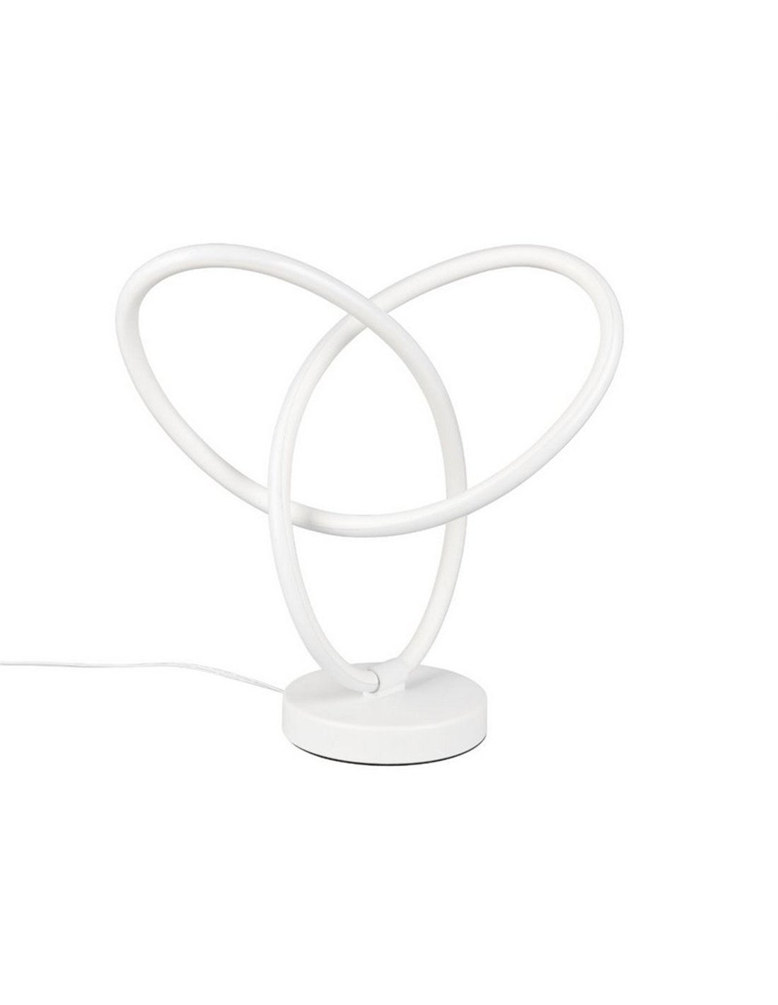Die Tischlampe LED LANDO weiß bietet ein modernes und skulpturalen Design mit doppeltem ineinandergreifendem Ring, der eine gleichmäßige und dekorative Beleuchtung erzeugt. Mit 8W und 850 Lumen strahlt sie natürliches Weiß mit 4000K aus, ideal für Wohnzimmer, Schlafzimmer oder Büros. Sie enthält einen Schalter im Kabel. Schutz IP20.