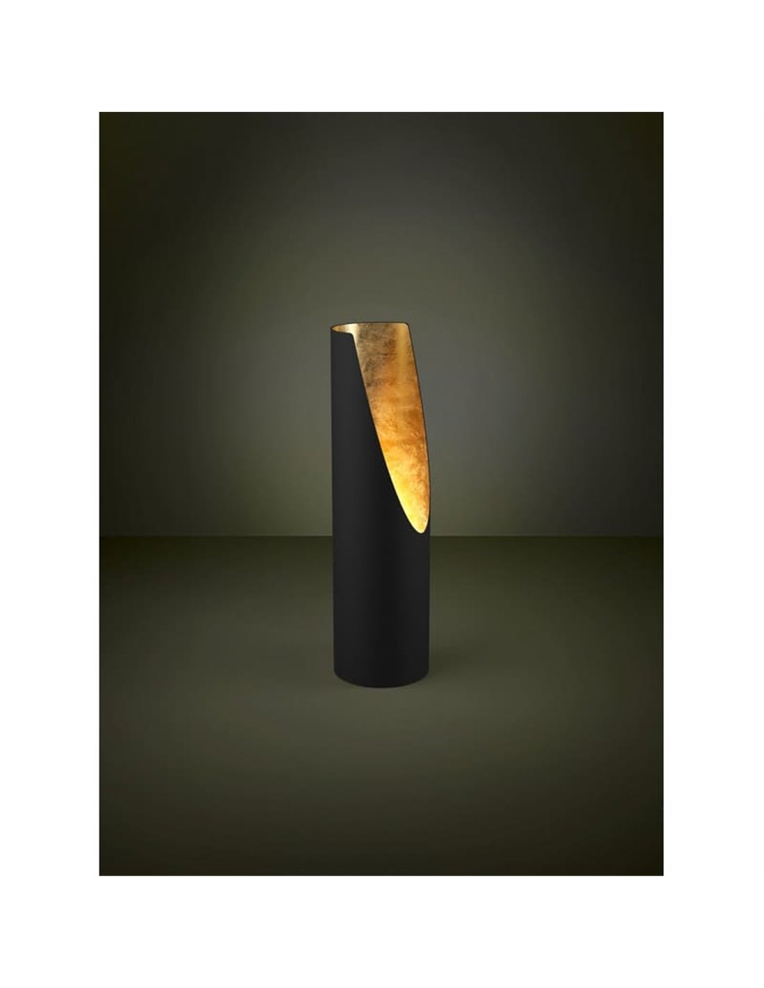PREBONE ist eine dekorationelle Tischlampe, die sowohl ausgeschaltet als auch eingeschaltet beeindruckt. Ihre zylindrische Form in mattem Schwarz mit goldenem Innenraum erzeugt einen eleganten Kontrast und ein sehr angenehmes warmes Licht.