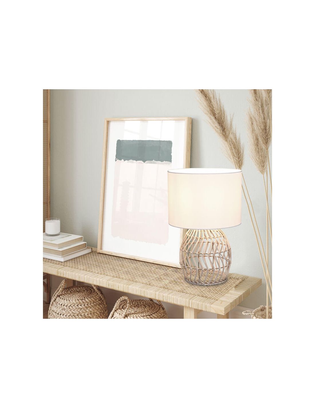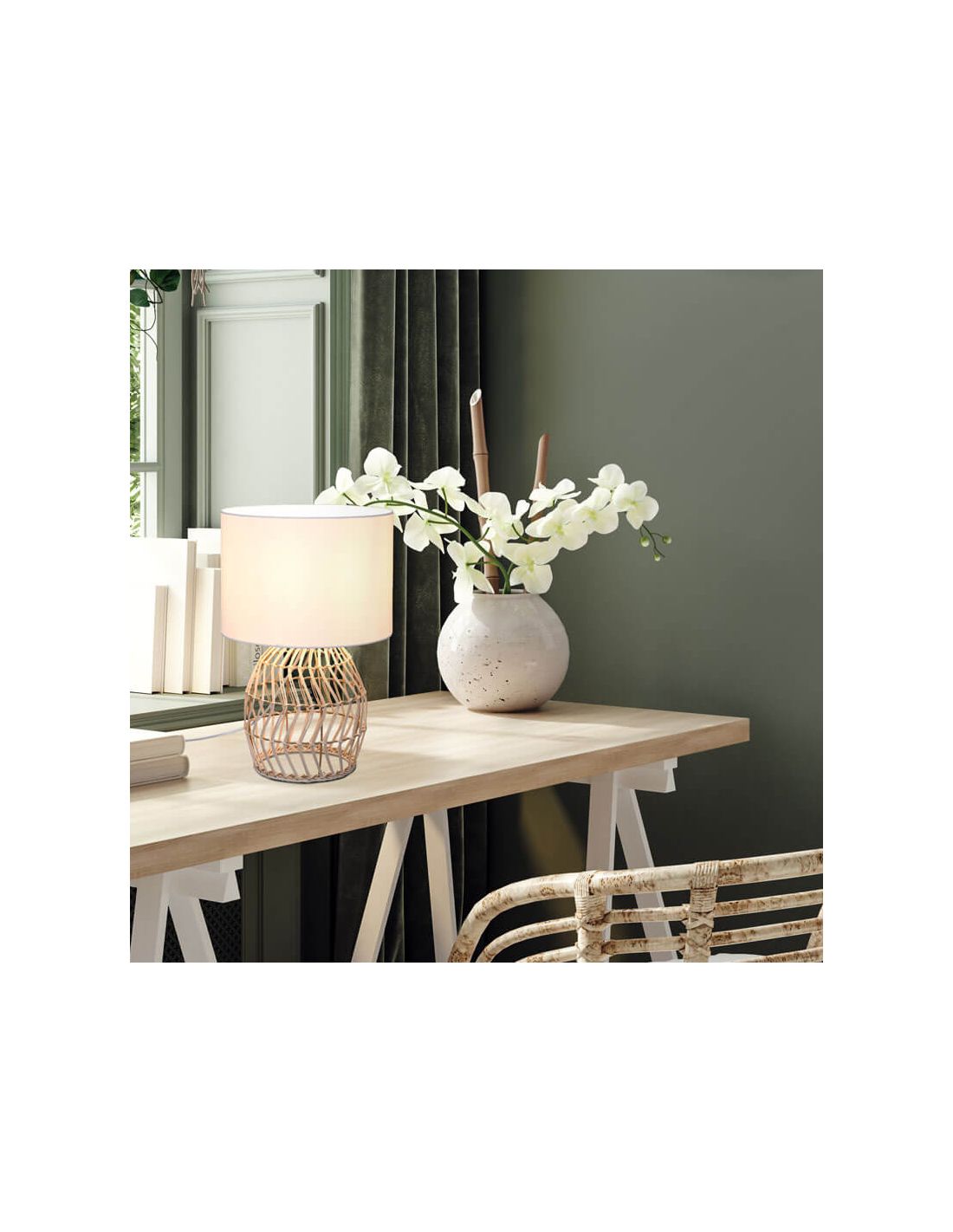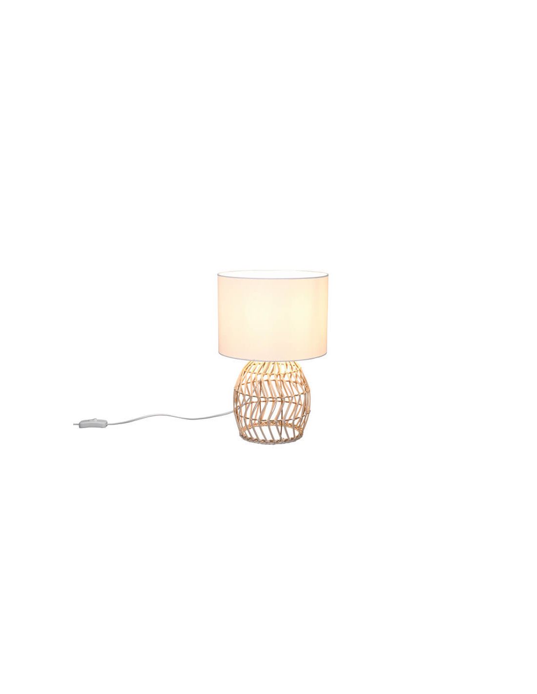 Die Tischlampe RIKE überrascht durch die Genialität ihres Designs, das natürliches Rattan-Geflecht mit Stoff in Weiß kombiniert. Sie hat praktische Maße von 38 Zentimetern Höhe, 25 Zentimetern Durchmesser und wiegt gerade einmal 0,52 kg.
