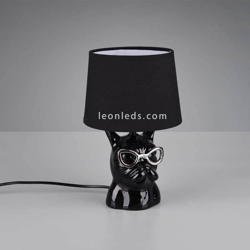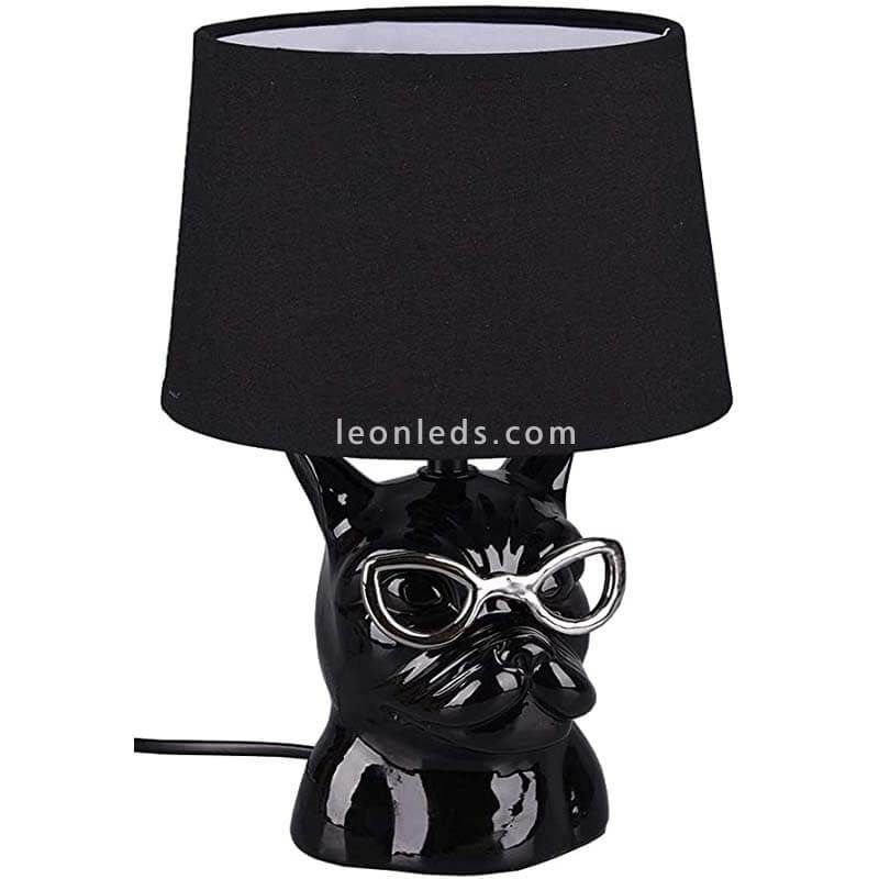 Diese Nachttischlampe bietet ein originales Design, ihr Körper aus Keramik imitiert den Kopf eines Hundes mit Brille. Ihr runder, textiler Schirm hat eine runde Form in Schwarz, wobei der Durchmesser unten größer ist als oben.