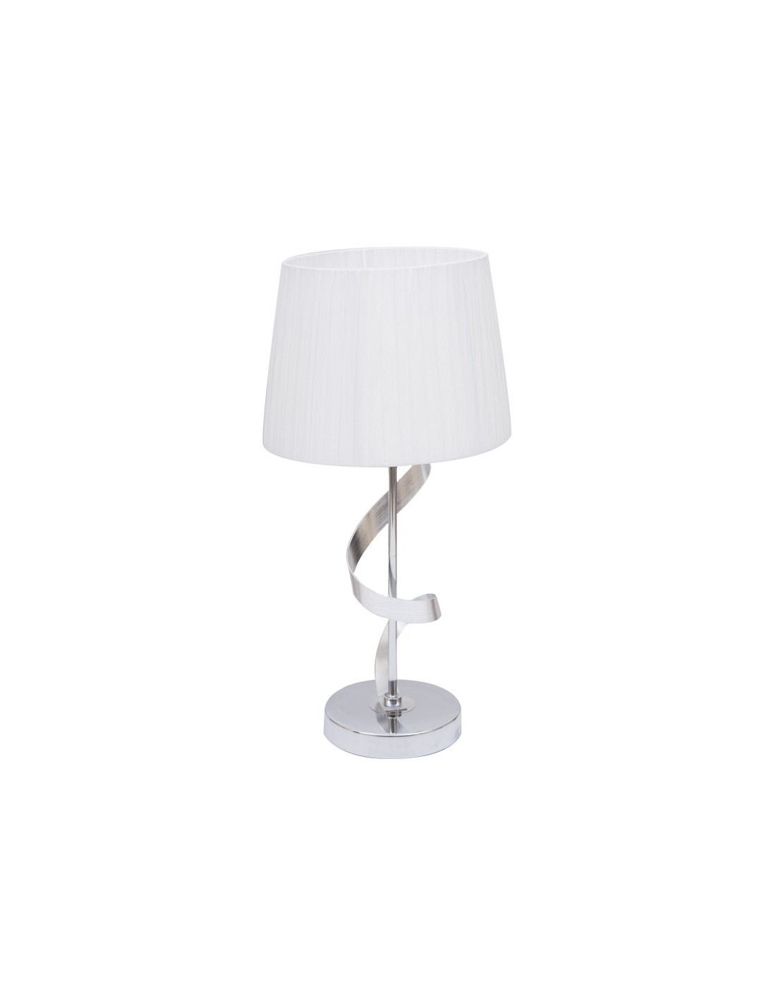 Der Schirm ist weiß und hat einen Durchmesser von 25 cm. Der Stoff des Schirms ist gerippt und weiß. Der Sockel ist in Chromfarbe und hat eine Gesamthöhe von 46 cm.
