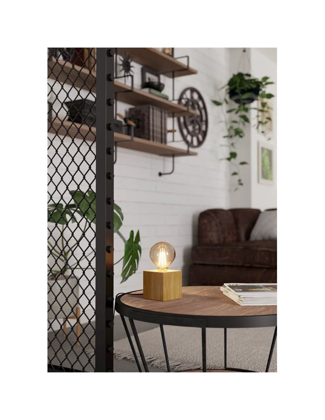 Die Tischlampe PRESTWICK 2 von Eglo besteht aus Naturkautschukholz mit würfelförmigem Design. Abmessungen: ↕ 95 mm | ↔ 95 mm.