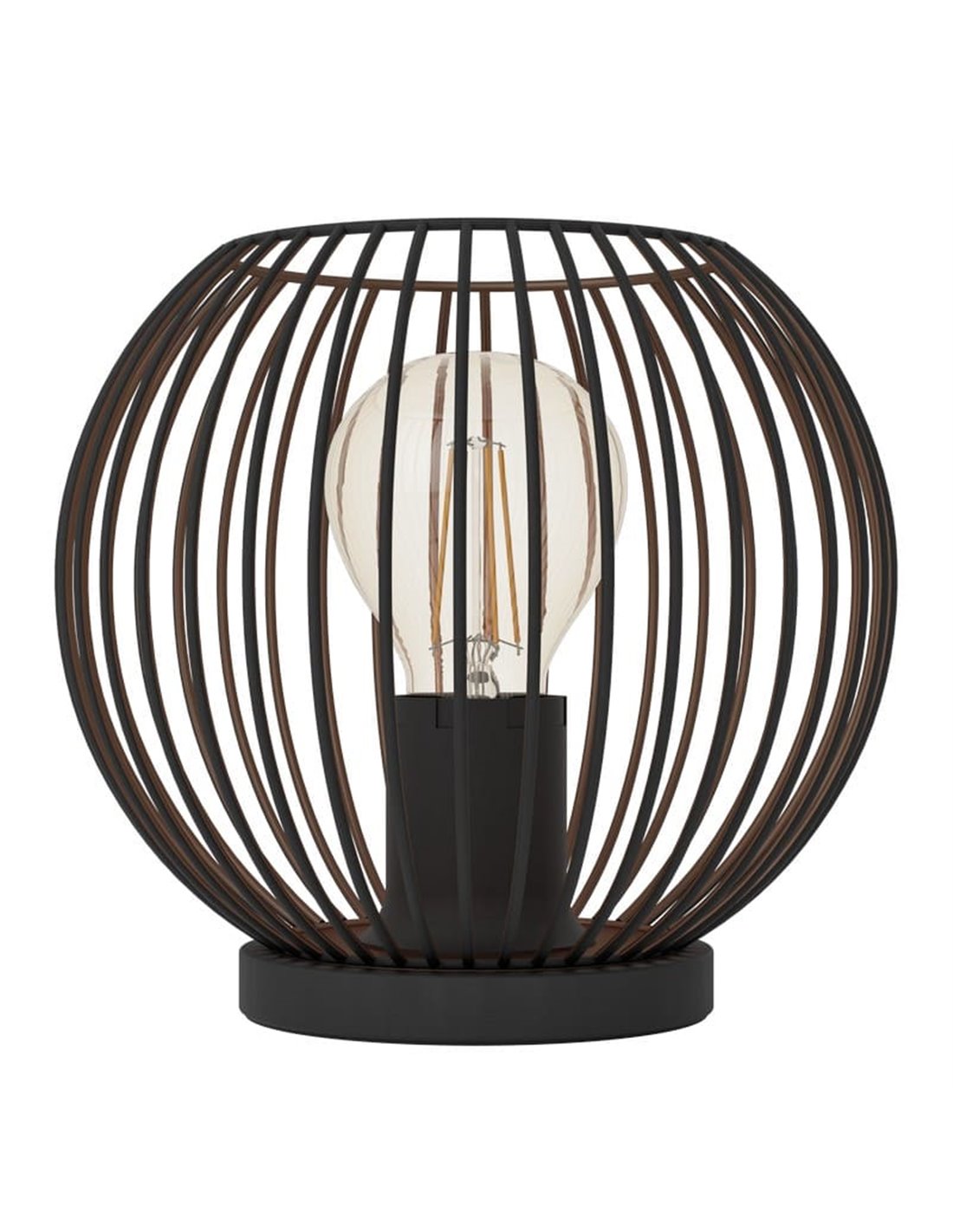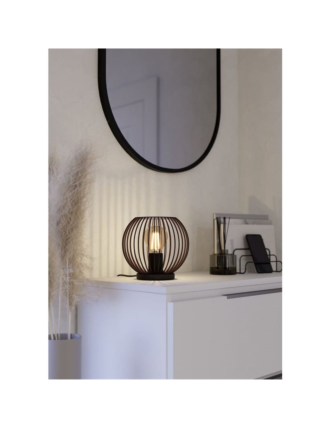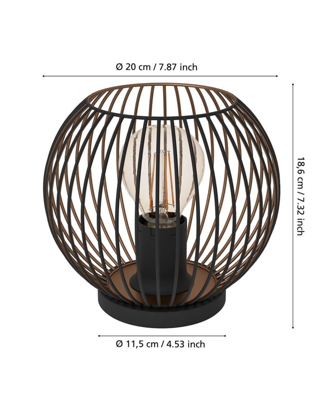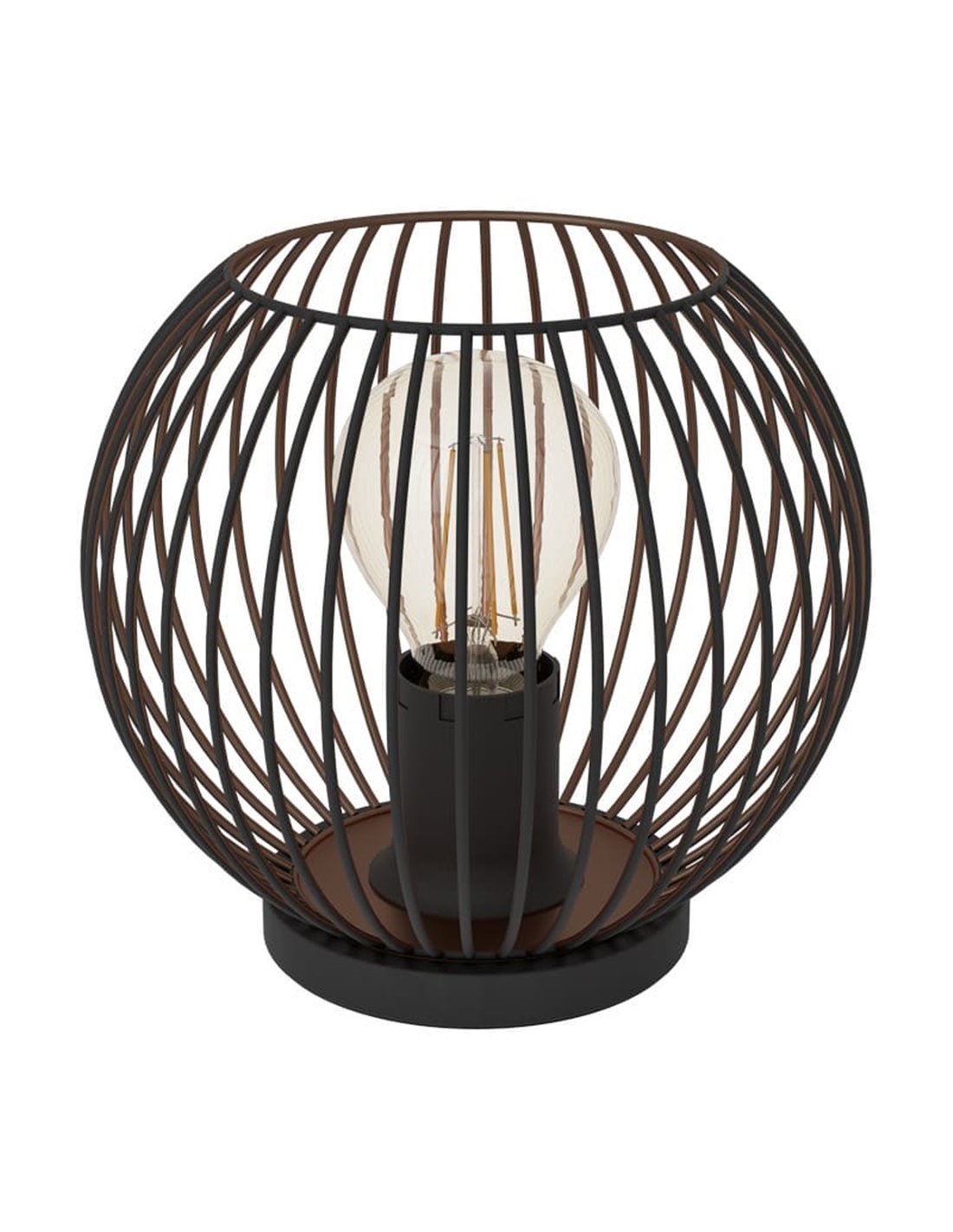 Tischleuchte im modernen industriellen Stil, gefertigt aus schwarzem Stahl mit Innenkupfer. Käfigdesign mit offener Struktur, das einen dekorativen Licht- und Schattenspieleffekt erzeugt. Kompatibel mit E27-Lampe (nicht enthalten). Mit Schalter im Kabel. Ideal für Wohnzimmer, Schlafzimmer oder Flur. IP20.