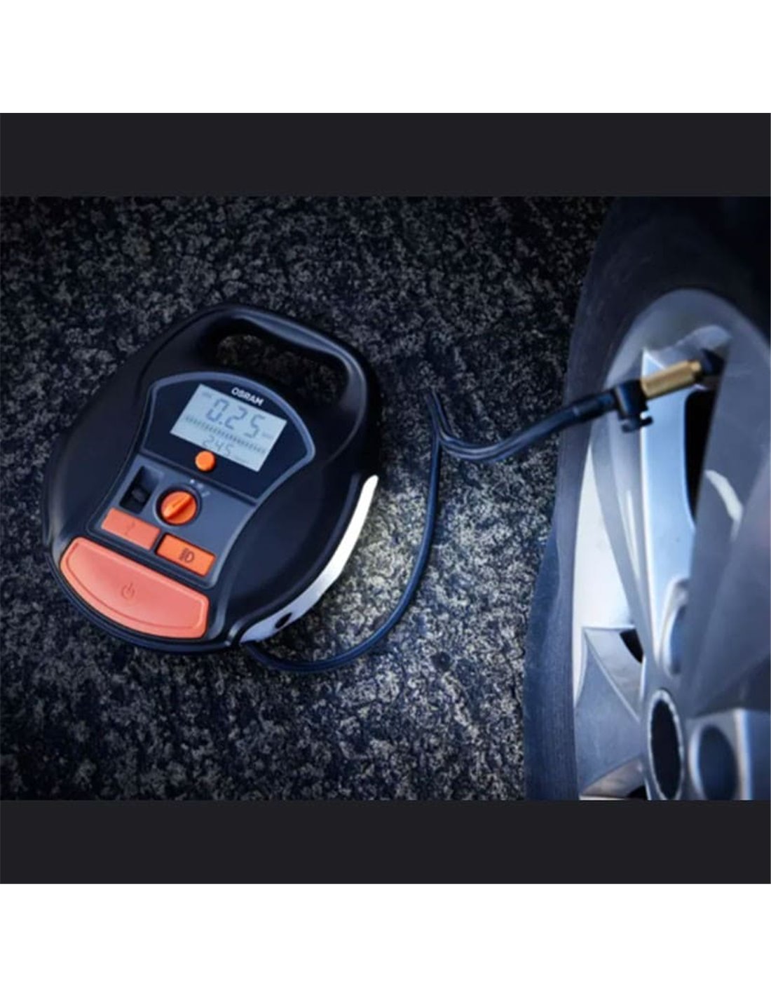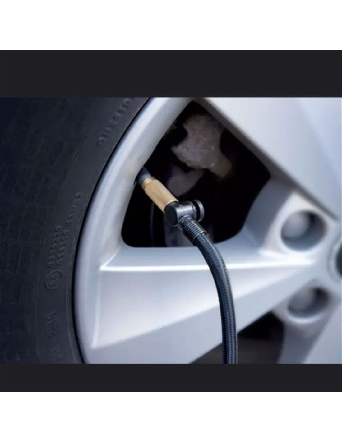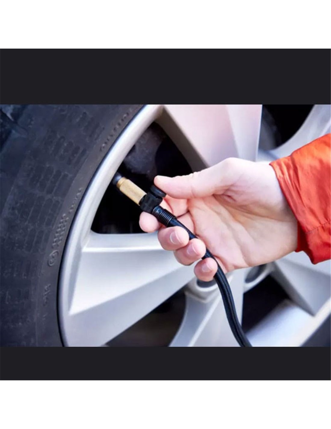 Er beinhaltet einen Schlauch und ein USB-Kabel (Ladung), um alle Reifen zu erreichen, sowie einen Entlüftungsknopf für feine Anpassungen.