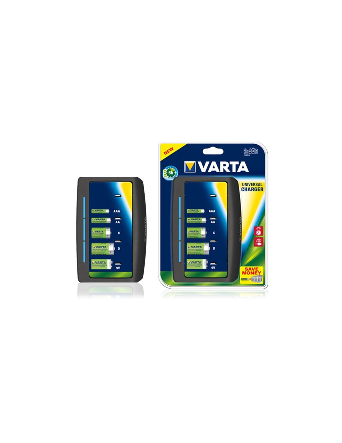 Universalladegerät für Wiederaufladbare Batterien der Marke Varta, akzeptiert AAA-, AA-, C-, D- und 9V-Batterien, ermöglicht das Laden von 2 oder 4 Batterien.