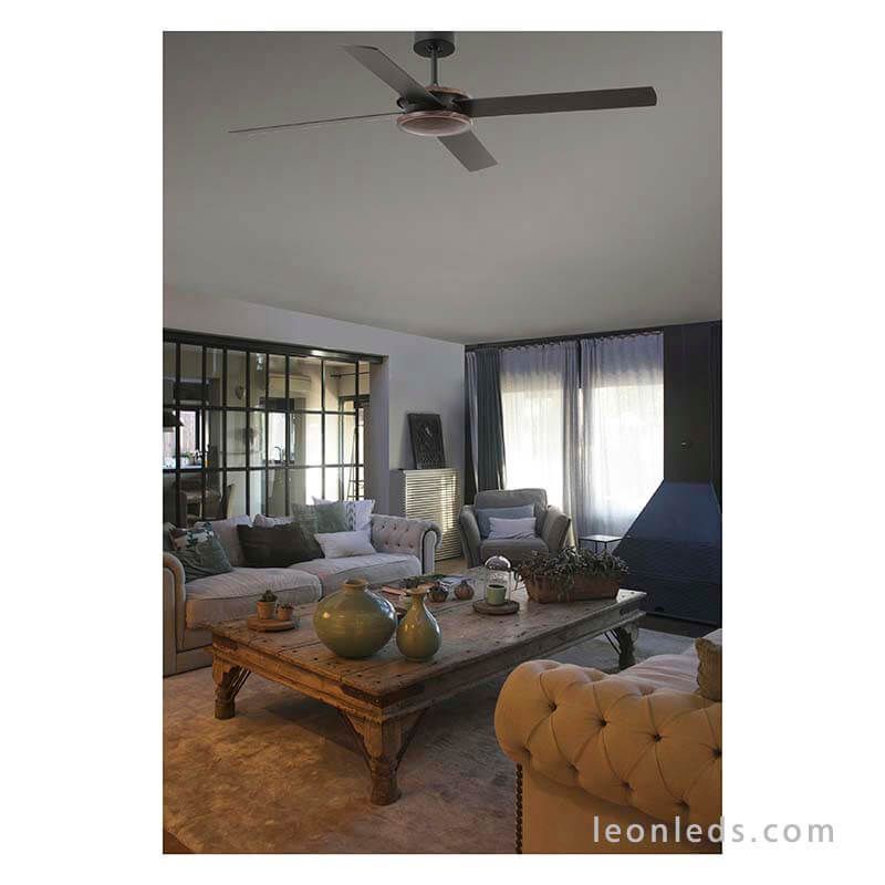 Der schwarze und braune Polea-Ventilator von Faro Barcelona ist perfekt für die Installation in Räumen mit einer Größe von 17,6 m² bis 28 m², wie Wohnzimmer, Schlafzimmer oder Gewerberäume.