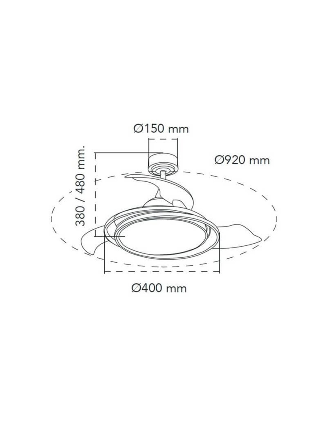 LED-Deckenventilator Antila Mini in Weiß. Ventilator mit ultra-leisem DC-Motor mit sechs Geschwindigkeitsstufen, Winter-Sommer-Umkehrfunktion und Brise. Sein Design mit faltbaren Blättern sorgt dafür, dass diese gesammelt sind, wenn der Ventilator nicht in Betrieb ist. Du kannst nur das Hauptlicht, nur den dekorativen Ring oder den gesamten Ventilator mit der Fernbedienung ein- oder ausschalten.