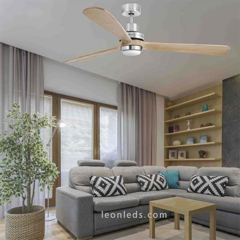 Der Deckenventilator der Lantau-G Serie mit LED-Licht in Kieferfarbe mit einer Leistung von 12 W, warmweißem Licht 3000 K und einer Leistung von 1000 Lm der Marke Faro Barcelona, ist ein Ventilator mit drei Flügeln aus natürlichem Kiefernholz und einem Gehäuse aus nickelmattem Stahl. Die Flügel haben einen Gesamtdurchmesser von 168 CM, die Deckenbasis hat einen Durchmesser von 15 CM und 41 CM Gesamthöhe des Ventilators.
