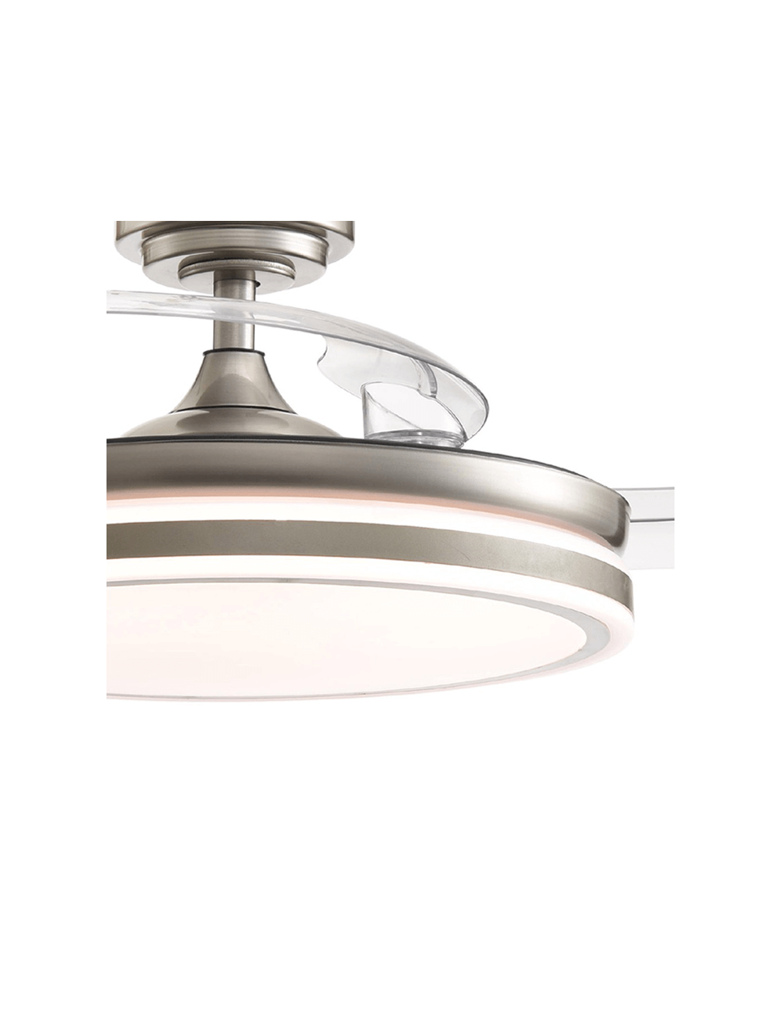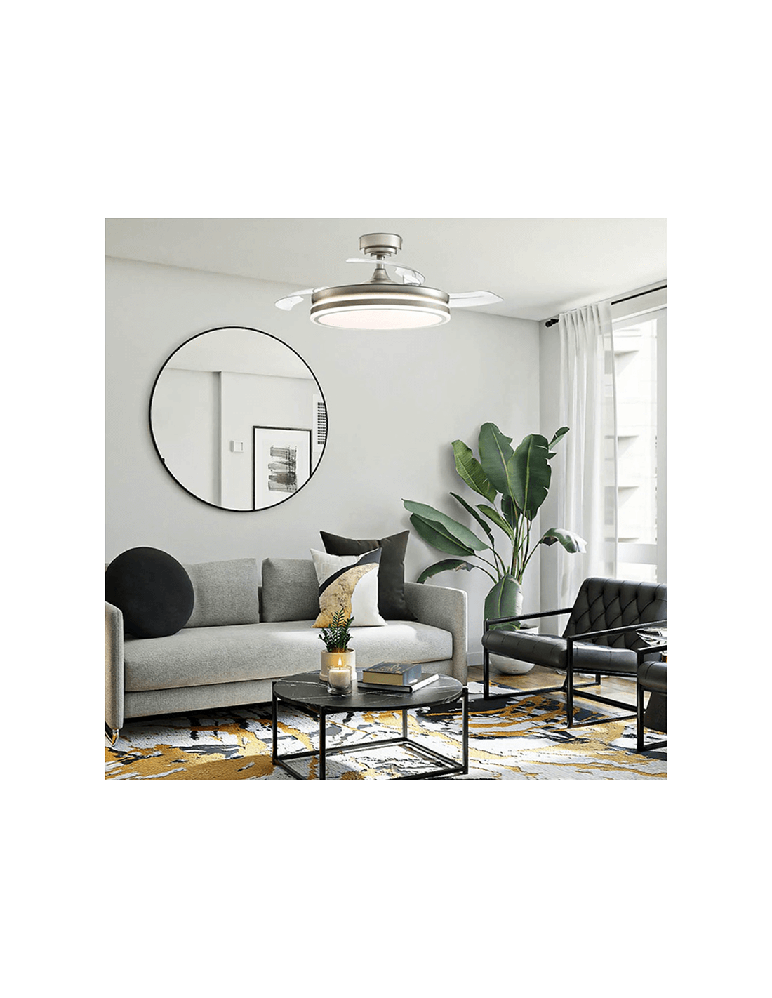 Moss ist ein LED-Deckenventilator mit einziehbaren Flügeln, ideal zum Beleuchten und Abkühlen von Wohnzimmern und Schlafzimmern sowie anderen Innenräumen auf eine leise, effiziente und moderne Art und Weise, inspiriert von avantgardistischen Einrichtungskonzepten.