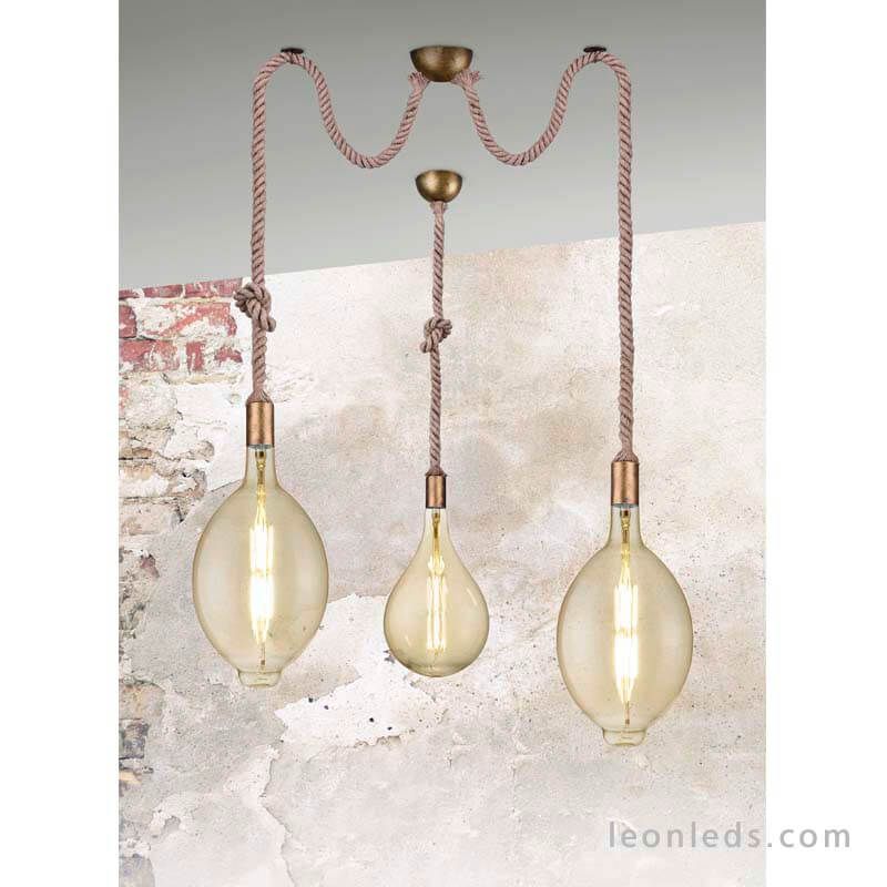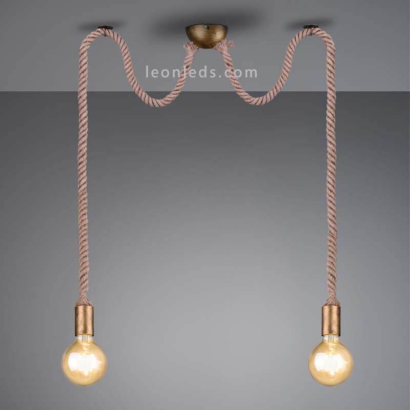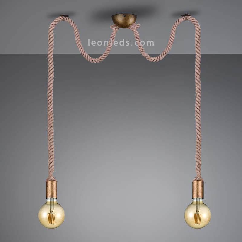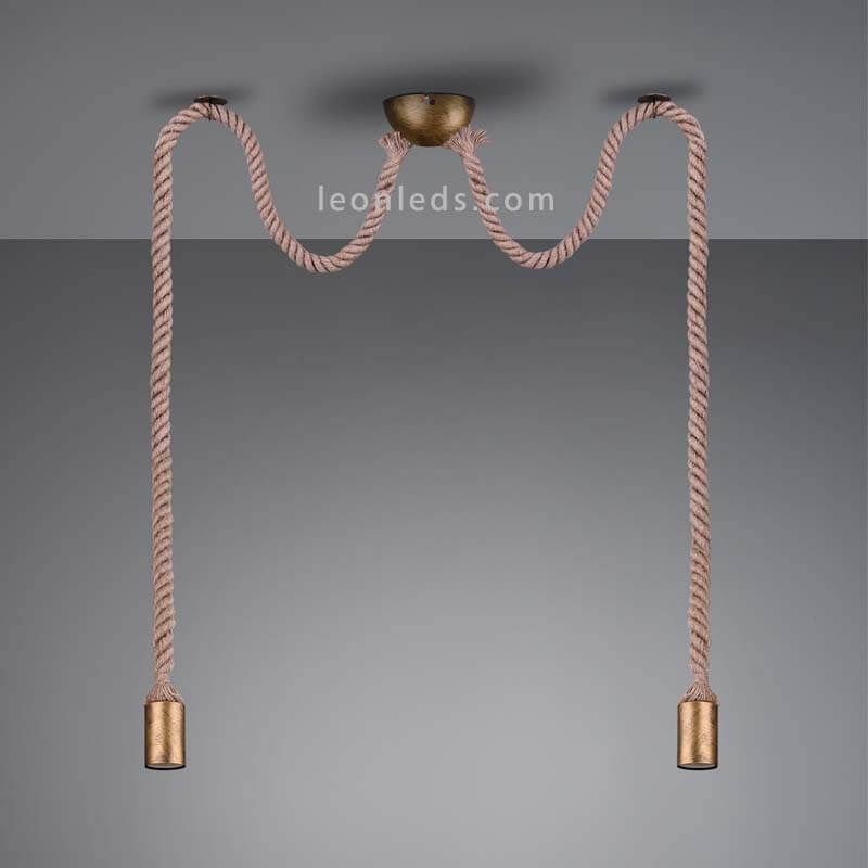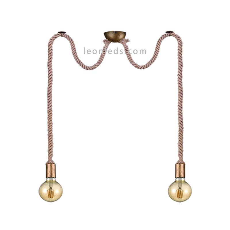 Vintage Deckenlampe mit 2 Seilen und einer runden Deckenbasis in patiniertem Kupfer mit einem Durchmesser von 10 cm. Die 2 Seile haben eine Gesamthöhe von 150 cm, die durch Knoten verkürzt werden kann, wie auf einem der Fotos zu sehen ist, um sie an die gewünschte Länge anzupassen. Wir empfehlen, in dieser Deckenlampe zwei LED-Birnen mit E27-Sockel und globo G120 in Goldfarbe zu installieren.