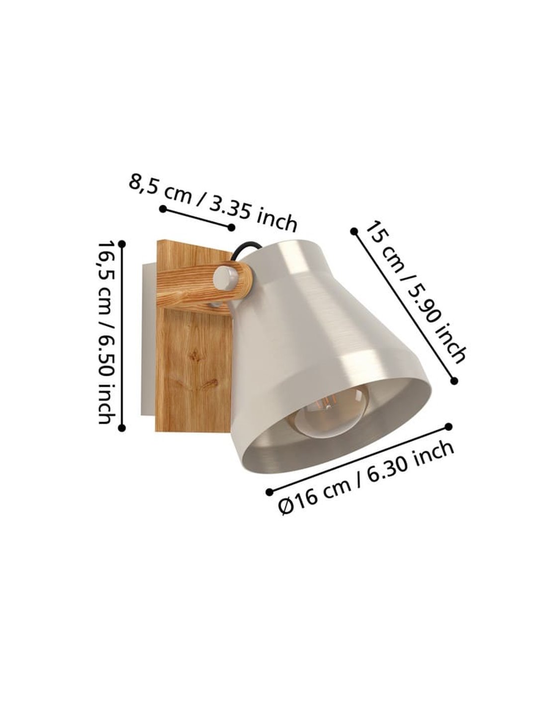 Die Wand- und Deckenlampe CAWTON kombiniert rustikales Holz und mattiertem cremefarbenen Stahl mit einem schwenkbaren Schirm. Abmessungen: ↕ 195 mm | ↔ 160 mm.