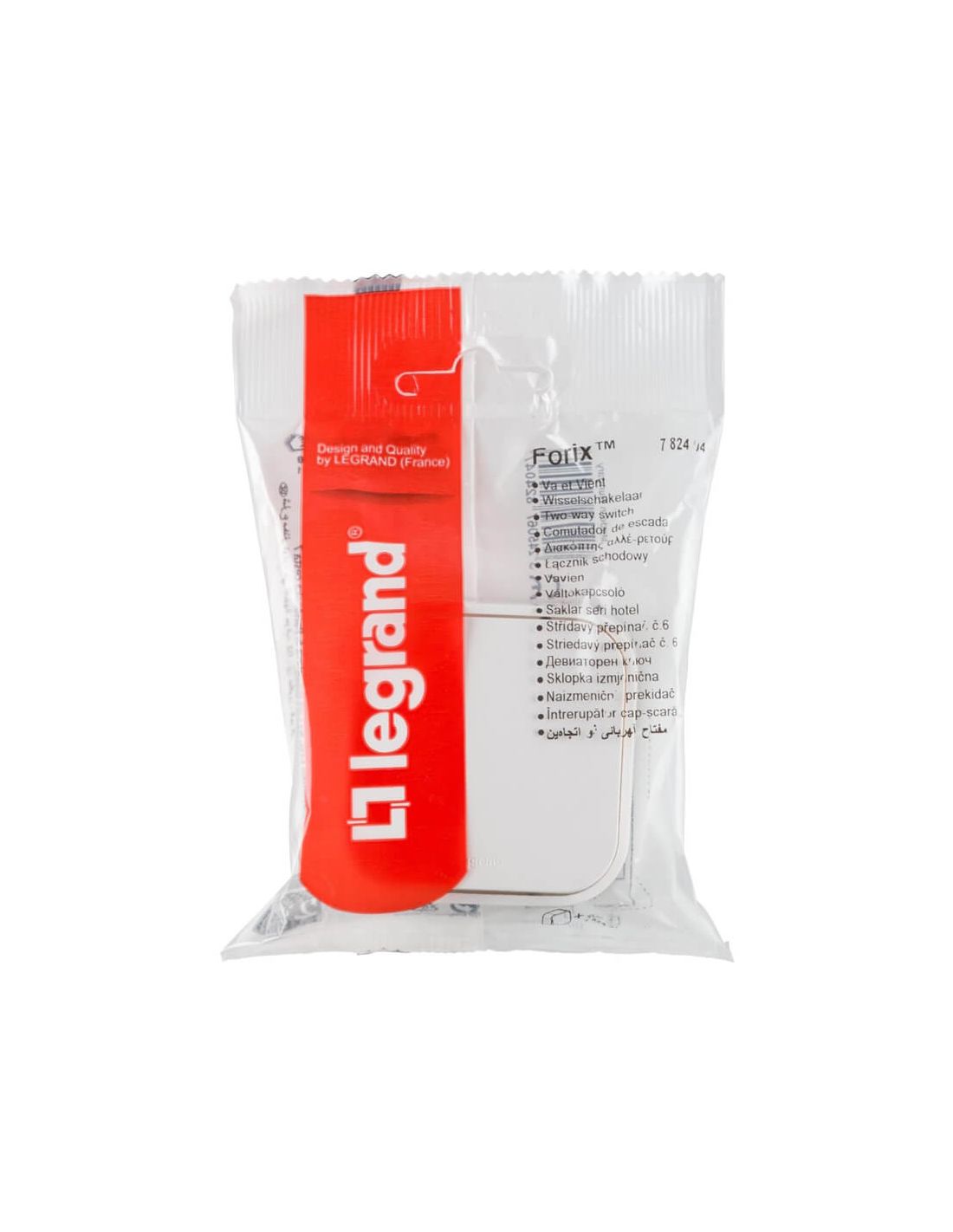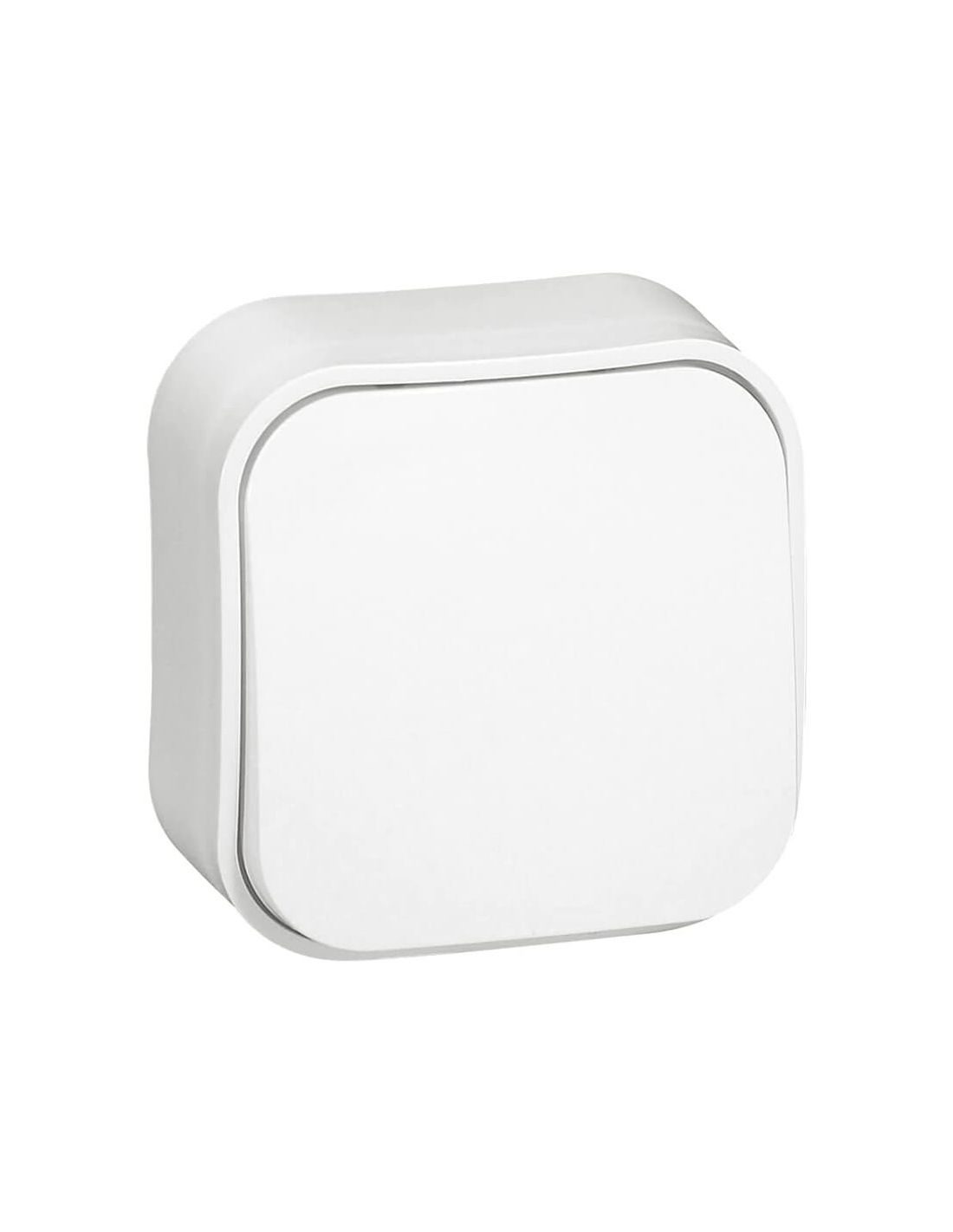 Wandeinspeisung Legrand 782420, mit 1 Schuko-Buchse, weißer Oberfläche. Enthält Schalter und Frontplatte. Verbindung über Schrauben, entspricht der IEC-Norm. Schutzgrad IP2X.