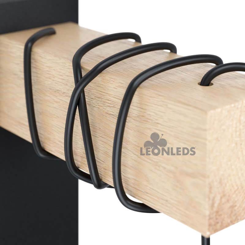 Diese hängende Wandleuchte hat eine helle Holz-Oberfläche und schwarzen Stahl. Ihr vintage und industrielles Aussehen sticht hervor. Sie hat einen hängenden E27-Fassung, der an einem schwarzen Kabel hängt, das sich in der Holzstruktur umwickeln kann.