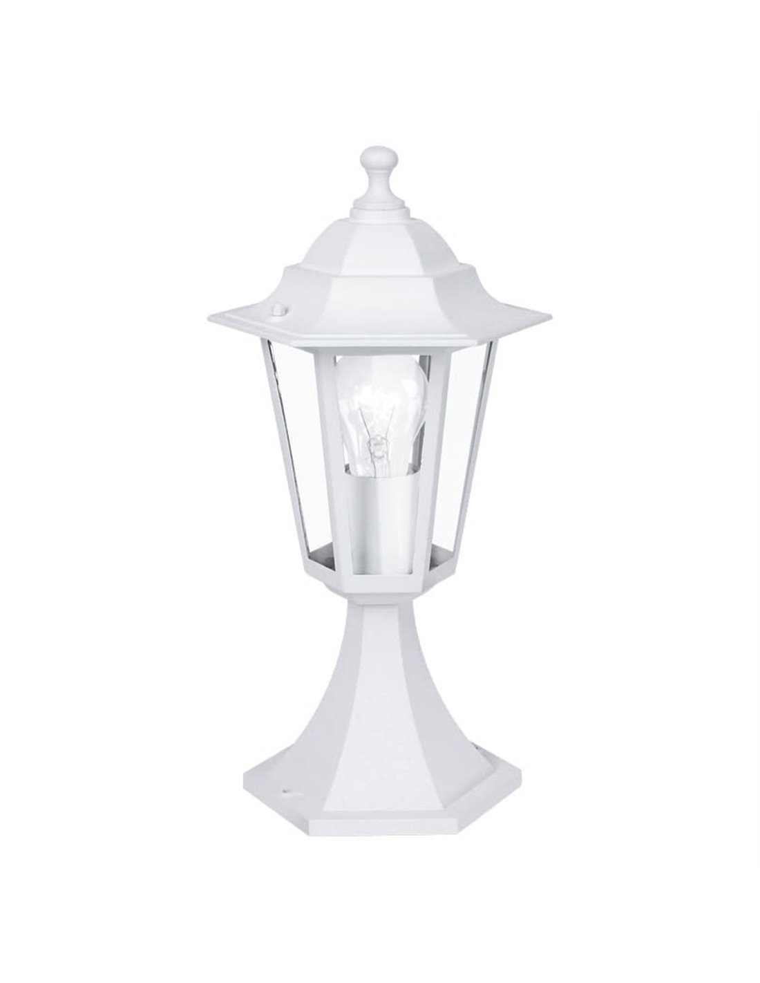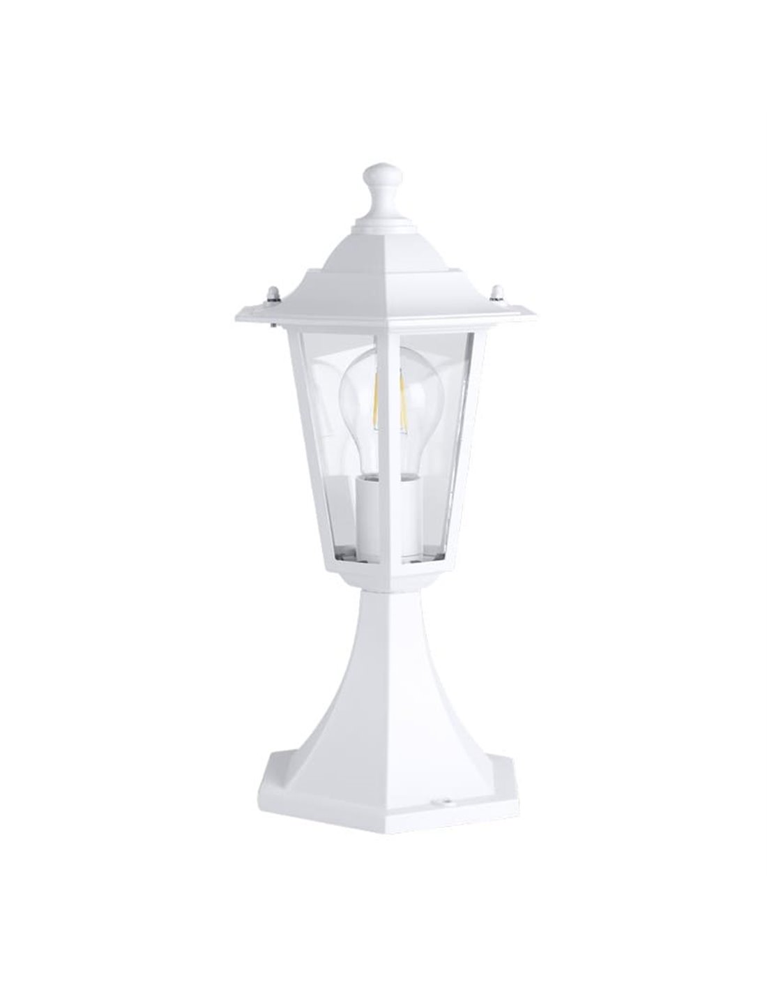 Laterne LATERNA 5 von EGLO in weiß mit transparentem Glas. Für E27 Glühbirne (nicht enthalten) und IP44. Körper aus druckgegossenem Aluminium. Maße ca.: 385 mm hoch, Ø 195 mm; Basis Ø 170 mm. Ideal für Wege und Gartenbereiche.