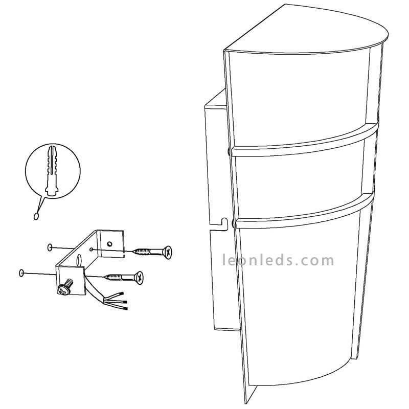 Sie verfügt über integrierte LED-Technologie mit 1 LED, die einen Lichtstrahl in 3000K und 360Lm mit einer Leistung von 2X2,5W abgibt. Sie hat einen verlängerten weißen Schirm, hinter dem die LED geschützt ist vor sämtlichen Witterungseinflüssen, dank ihres Schutzes gegen Wasser und Staub mit IP44-Niveau. Außerdem wird das Licht frontal durch die Aluminiumbereiche, die die Lampe umgeben, abgegeben.