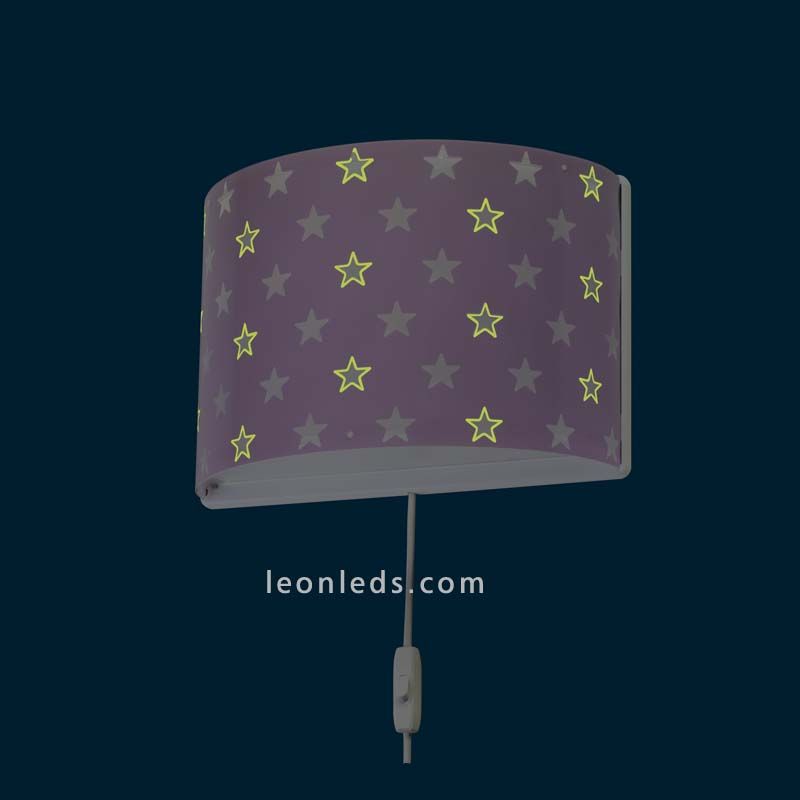 Wandleuchte für Kinder in Malva mit Schalter im Kabel aus der Serie Stars, mit einer Höhe von 22,5 cm und einer Länge von 31 cm, benötigt 1 LED-Birne mit E27-Schraubfassung und leuchtet im Dunkeln.