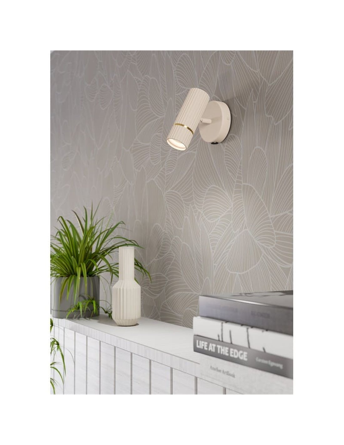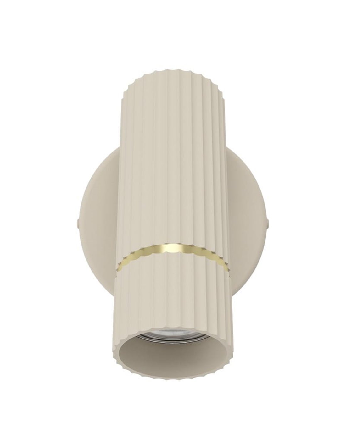 Die Wandleuchte CAMINIA hat eine Silhouette mit klaren Linien und einer Struktur aus Stahl, die in Sand und gebürstetem Messing verarbeitet ist. Ihr kompaktes Gehäuse wird an der Wand befestigt und lenkt das Licht komfortabel. Der Diffusor sorgt für eine gleichmäßige Beleuchtung ohne Blendung.