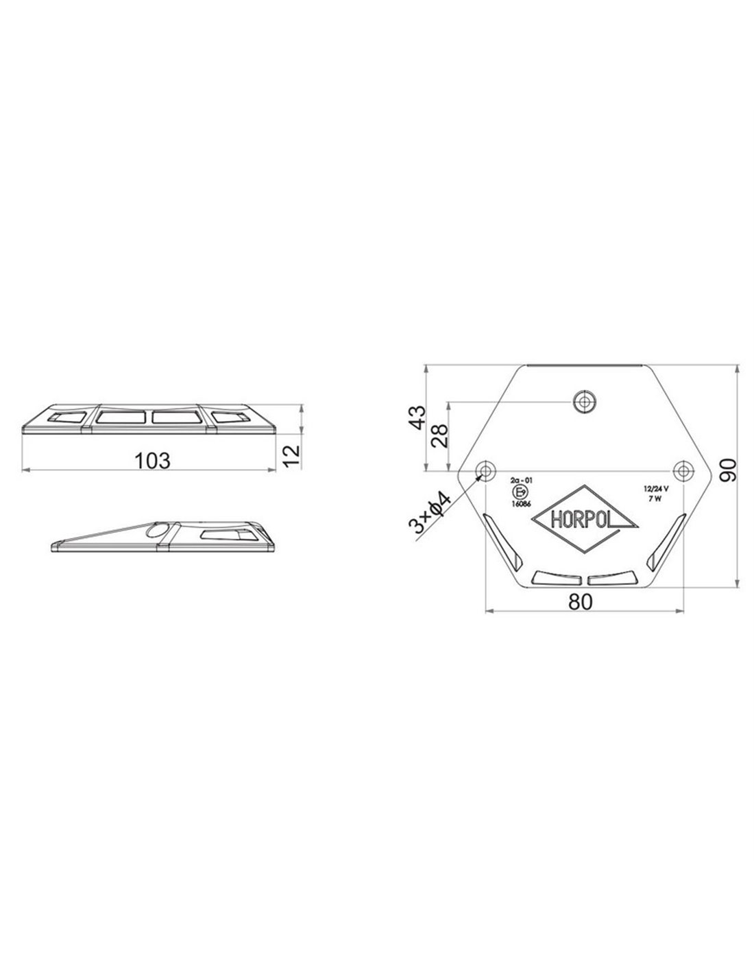 Abmessungen: Gesamtlänge 103 mm, Breite 80 mm, maximale Höhe 43 mm und Körperhöhe 12 mm. Befestigung erfolgt über 3 Löcher Ø 4 mm.