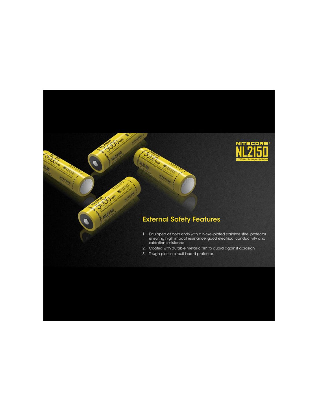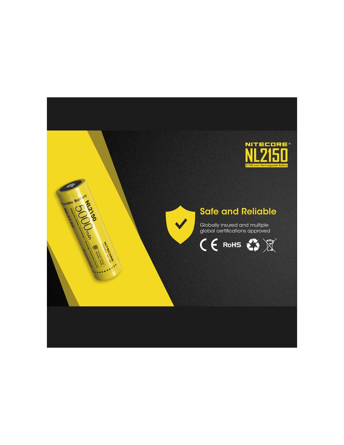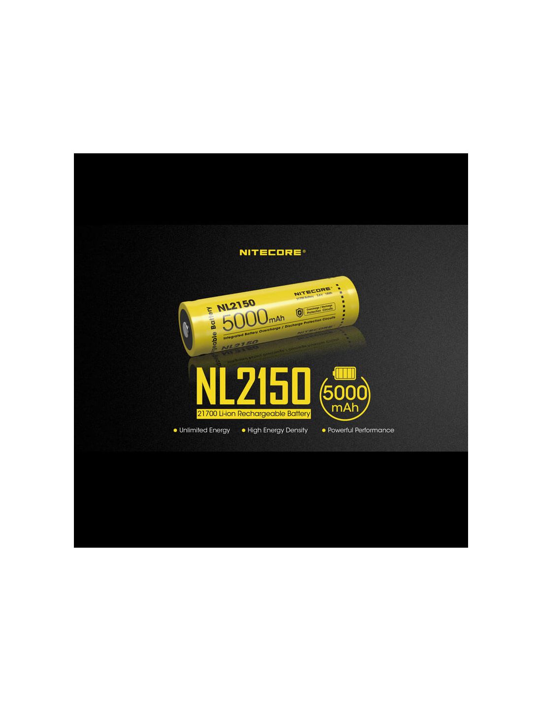 Wiederaufladbare 21700-Batterie der Marke Nitecore, Modell NL2150 mit einer Kapazität von 5000mAh und einer Betriebs- spannung von 3,6 Volt. Diese Lithium-Batterie ist die perfekte Wahl, wenn Sie eine langlebige hochkapazitative 27100 Batterie suchen. Lebensdauer von mindestens 500 Lade- und Entladezyklen.