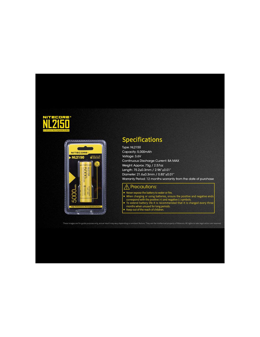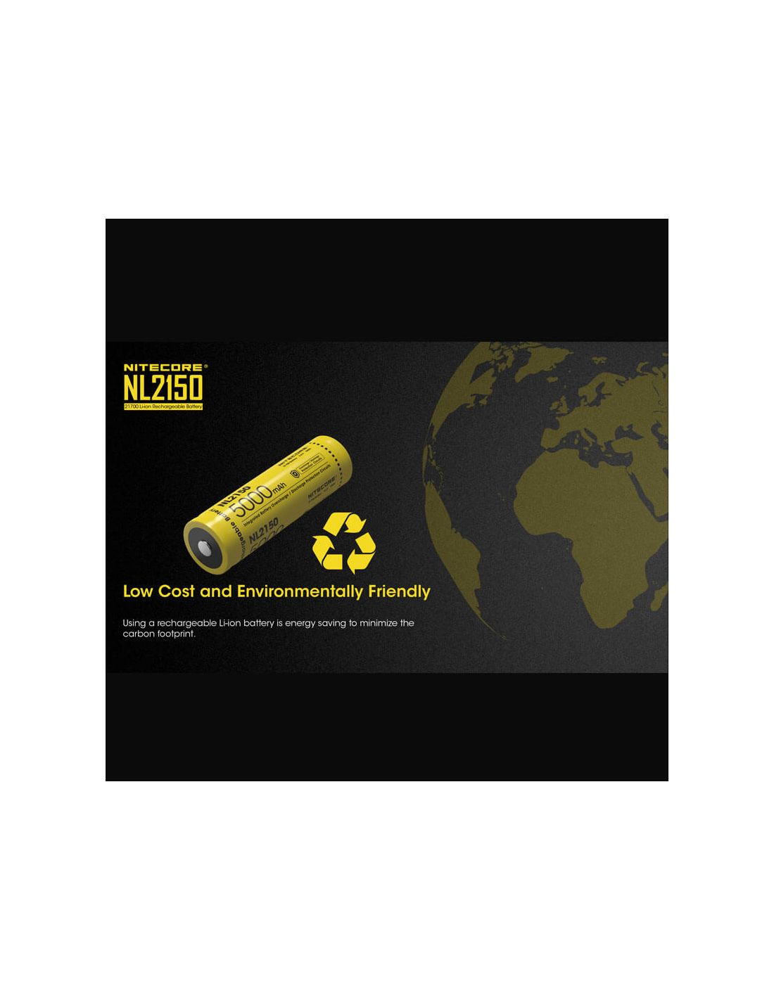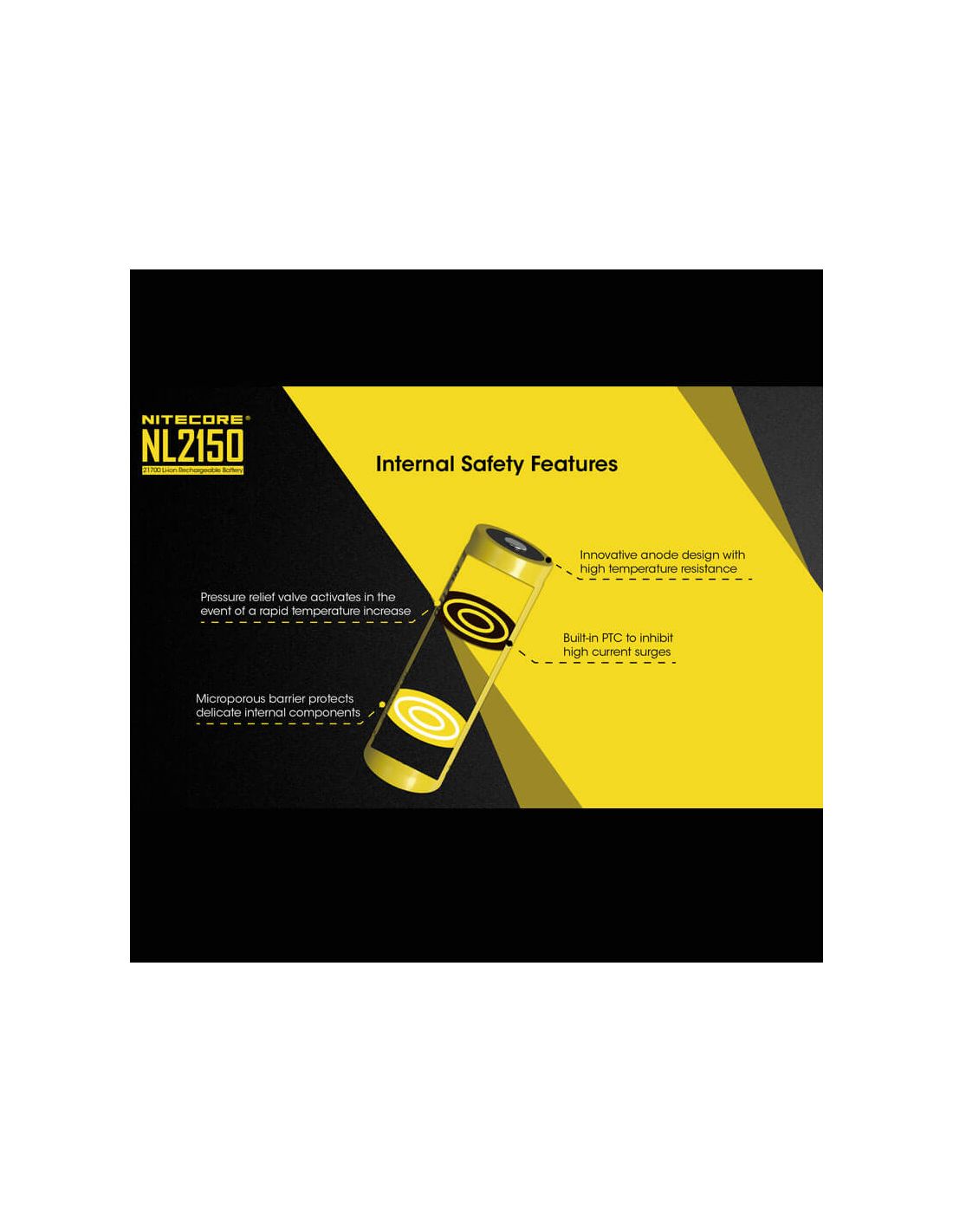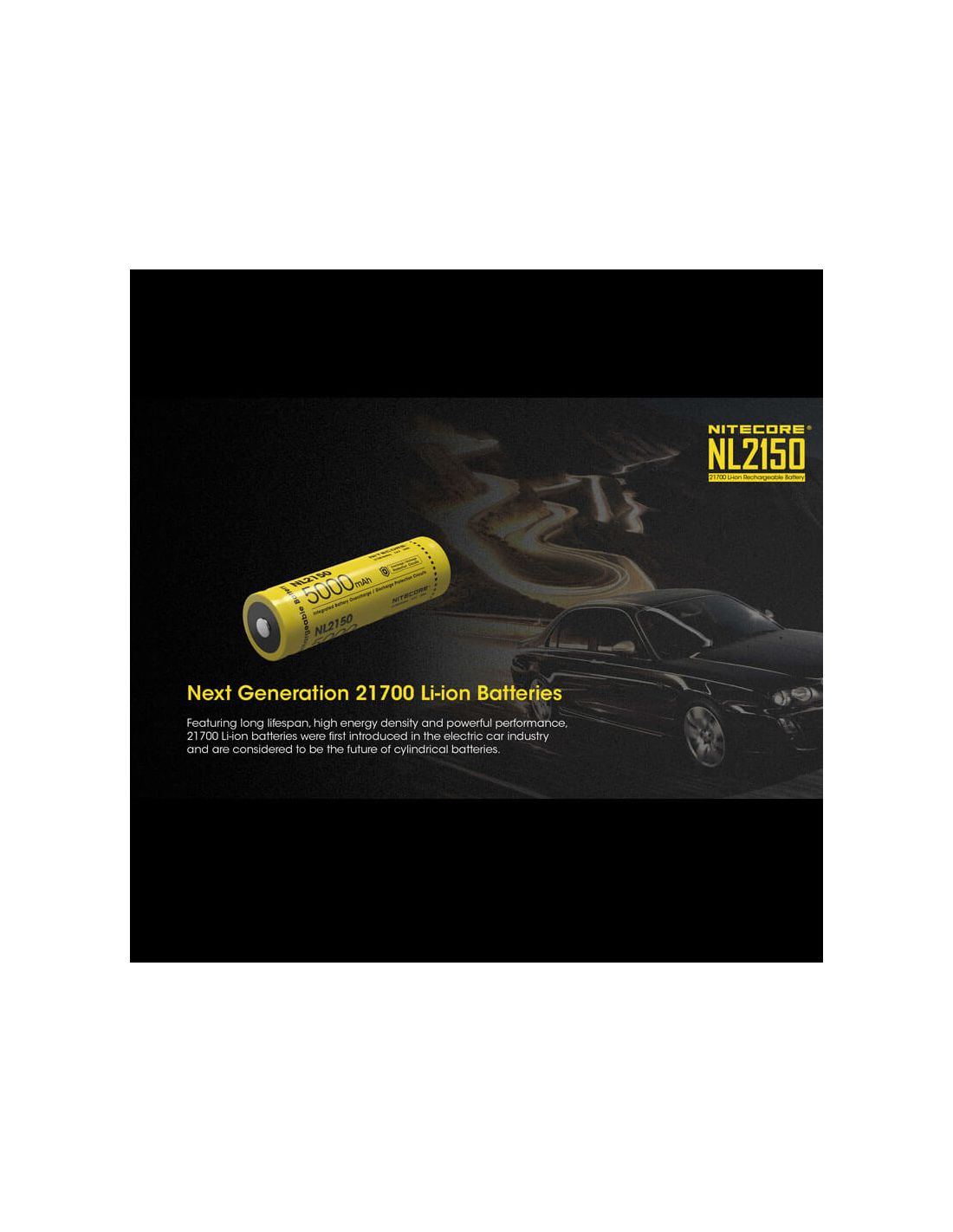 Wiederaufladbare 21700-Batterie der Marke Nitecore, Modell NL2150 mit einer Kapazität von 5000mAh und einer Betriebs- spannung von 3,6 Volt. Diese Lithium-Batterie ist die perfekte Wahl, wenn Sie eine langlebige hochkapazitative 27100 Batterie suchen. Lebensdauer von mindestens 500 Lade- und Entladezyklen.