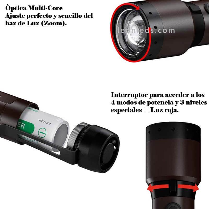 Wiederaufladbare LED-Lampe mit Zoom und 2.000 Lm maximale Intensität und bis zu 330 Meter von der Marke LedLenser Modell P7R Signature mit einer maximalen Akkulaufzeit von 70 Stunden und einer minimalen von 2,5 Stunden. Der Akku ist integriert und wird über Induktion mit dem mitgelieferten USB-Kabel aufgeladen. Diese wiederaufladbare LED-Lampe P7R Signature hat 4 Beleuchtungsmodi und 3 Spezialmodi sowie ein rotes Licht an der Rückseite, und ist staub- und wasserresistent mit IP68.