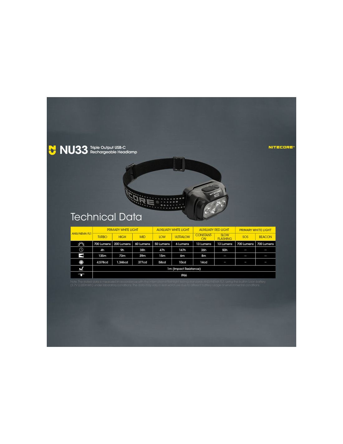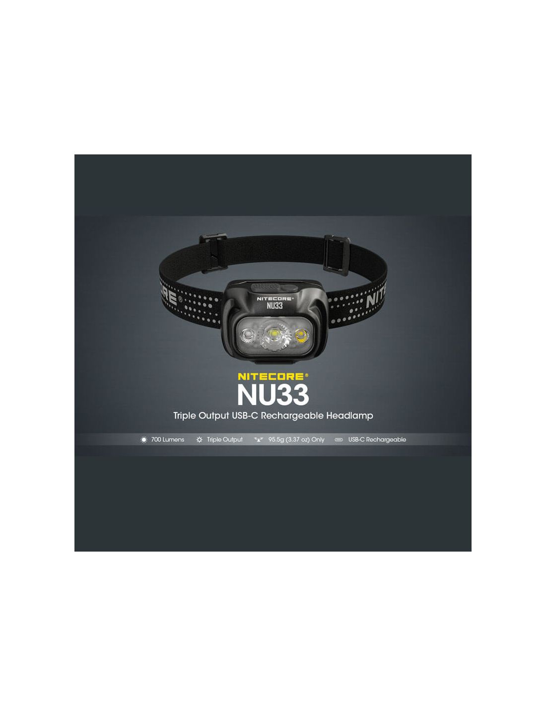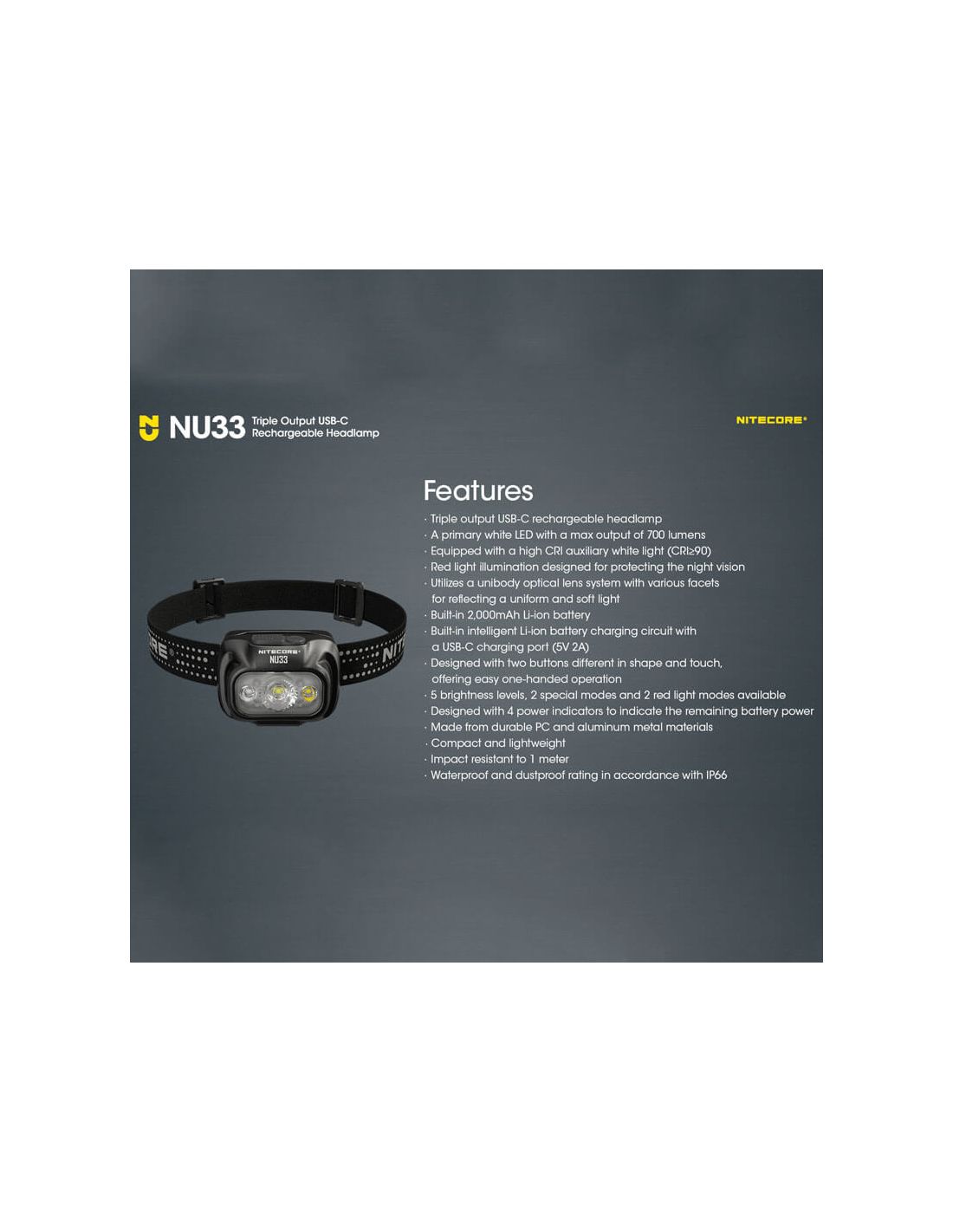Die wiederaufladbare LED Stirnlampe NU33 von Nitecore ist über USB-C schnell aufladbar, mit einer maximalen Leistung von 700lm, einer maximalen Reichweite von 135 Metern und einer Akkulaufzeit von 147 Stunden, stoßfest bis zu 1 Meter und einem IP66-Schutzgrad gegen Wasser und Staub (Schutz gegen Staub und Spritzwasser).