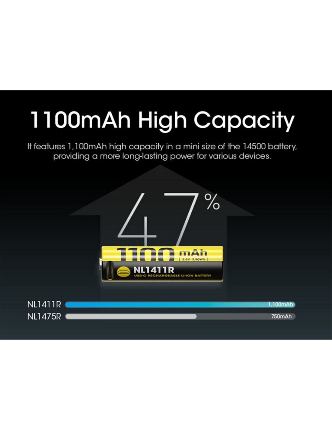 Die NITECORE NL1411R ist eine wiederaufladbare 14500 (AA-Format) Batterie, die speziell für LED-Taschenlampen und energieintensive elektronische Geräte entwickelt wurde. Mit einer Kapazität von 1100 mAh und konstanter Ausgangsspannung von 3.6 V bietet sie überlegene Leistung im Vergleich zu herkömmlichen AA-Batterien.