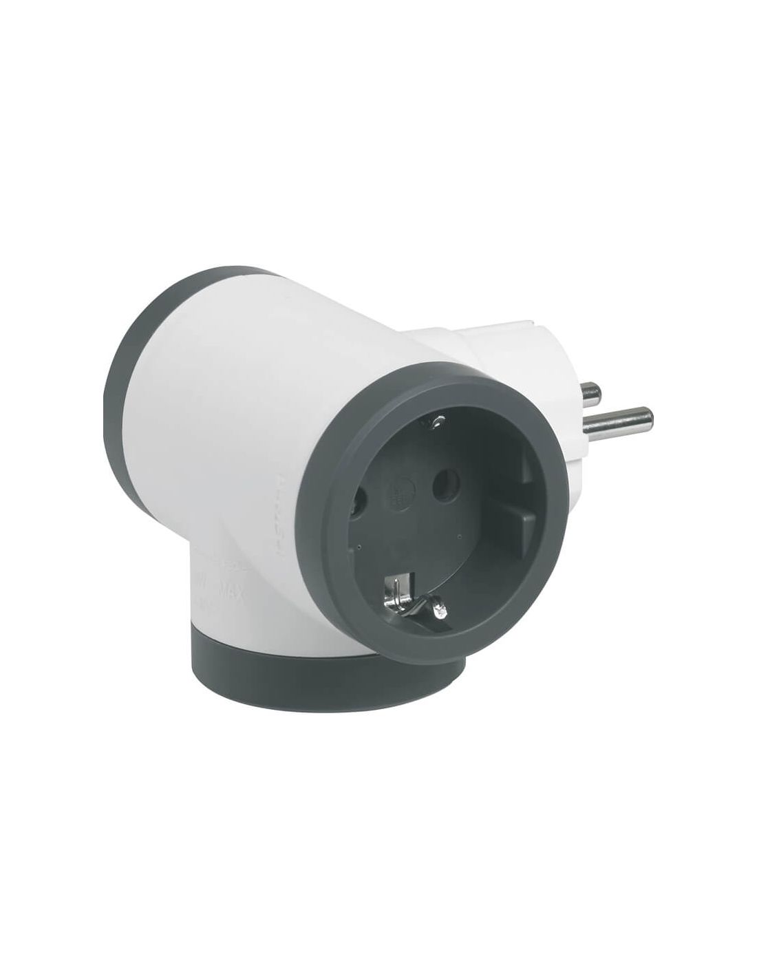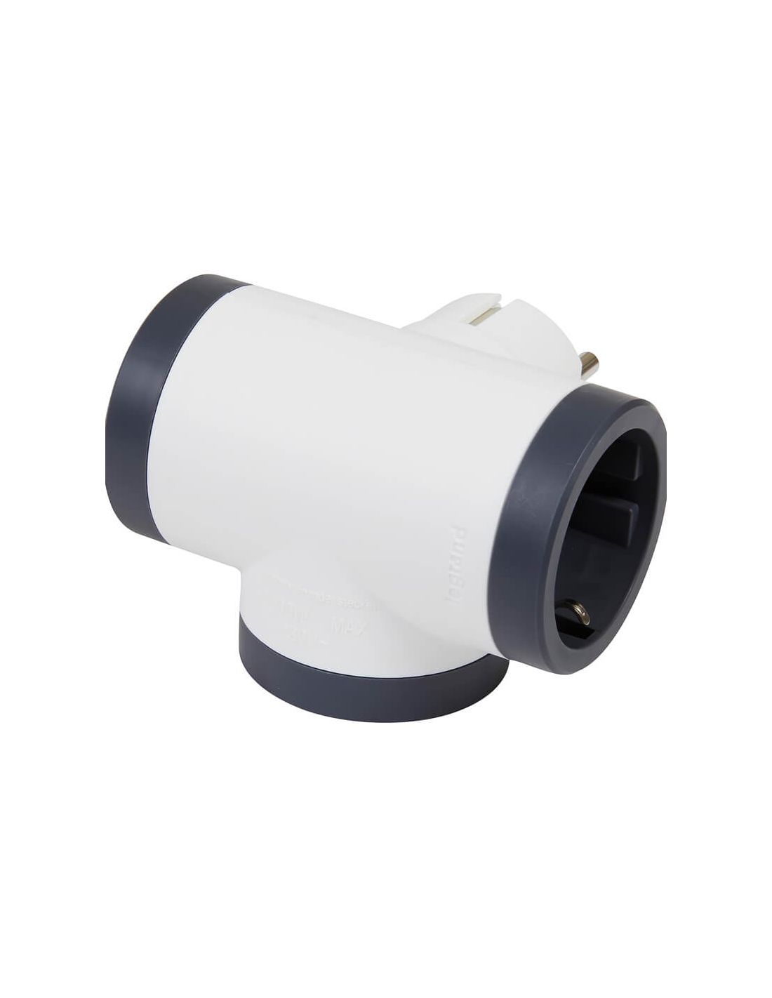 Adaptador triple Legrand 3x2P+T con entrada lateral y capacidad hasta 3680W. Soporta 16A a 230V, ideal para uso doméstico o profesional. Diseño robusto y compacto en blanco y negro, fabricado en termoplástico libre de halógenos.