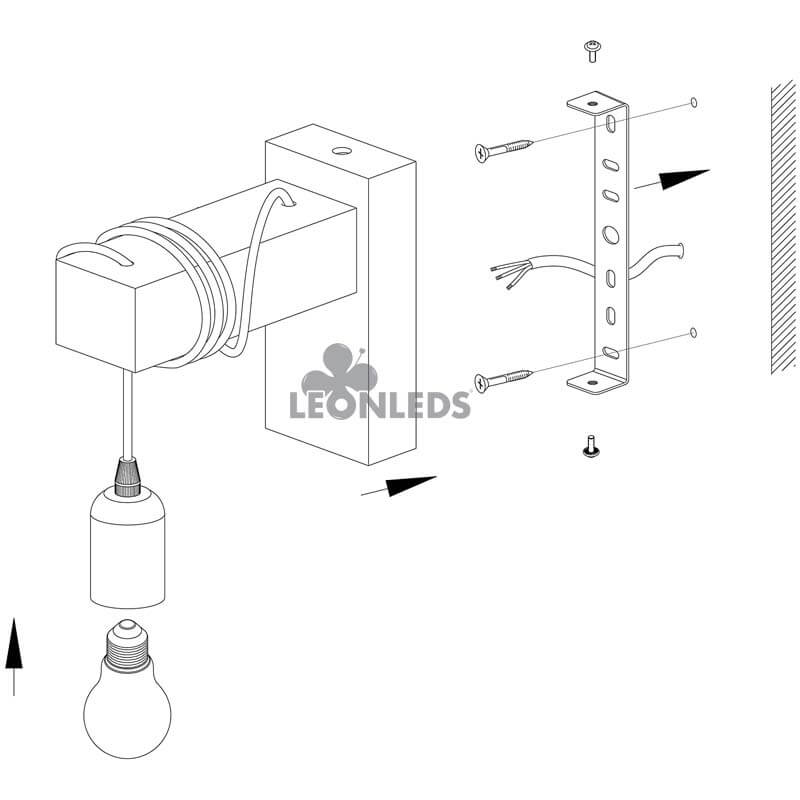 Para el correcto funcionamiento de este aplique de pared con lámpara colgante es necesario la colocación de una bombilla E27 (no incluida). Recomendamos utilizar un color de luz cálido 3.000k que potencie su estilo vintage e industrial. La potencia recomendable puede variar entre los 10 y 17W dependiendo de las dimensiones de la estancia a iluminar.