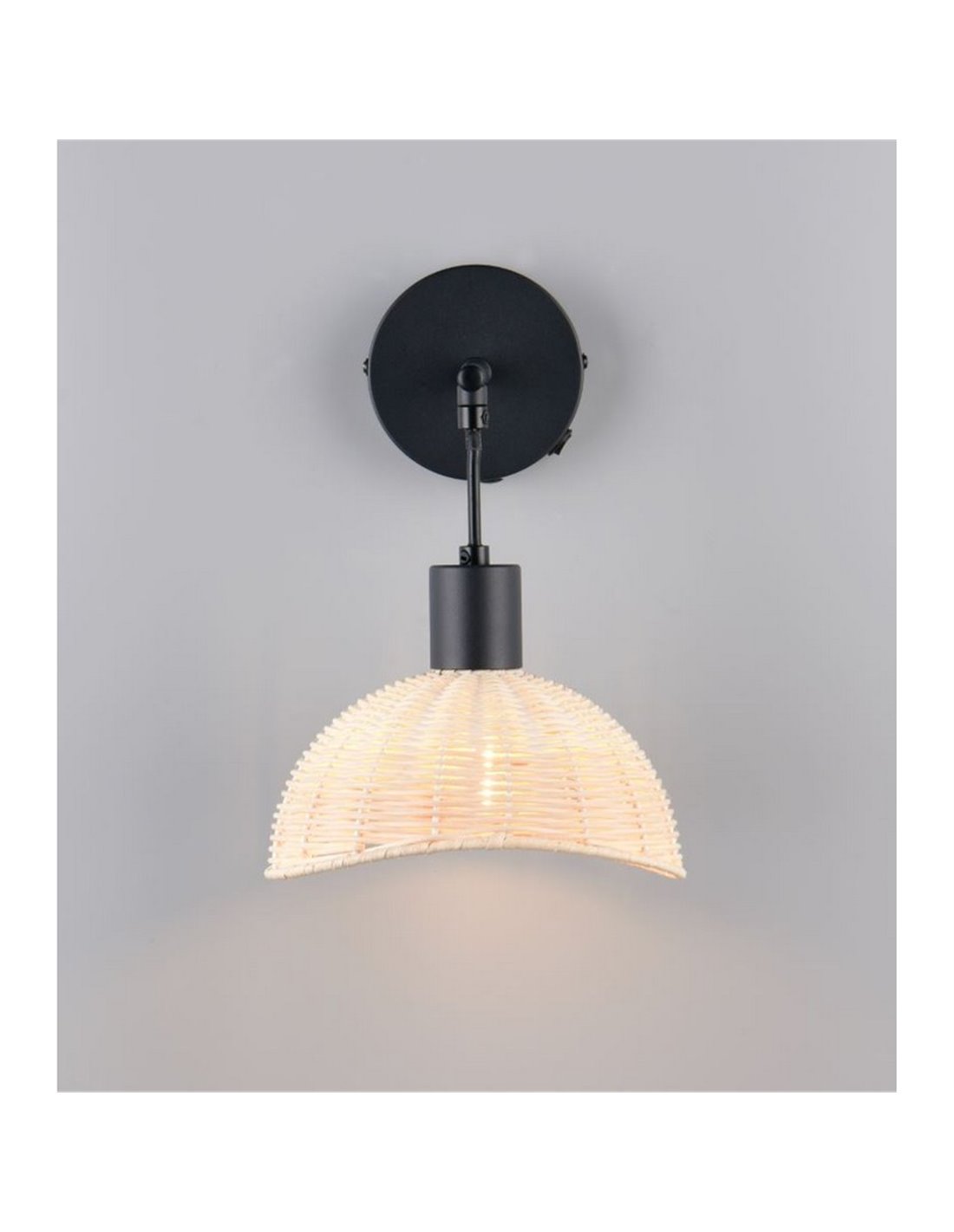 La estructura metálica negra combina elegancia y resistencia, mientras que el trenzado del rattan permite que la luz se filtre suavemente, creando un ambiente acogedor. Este aplique se integra fácilmente en estilos decorativos boho, nórdico o mediterráneo.