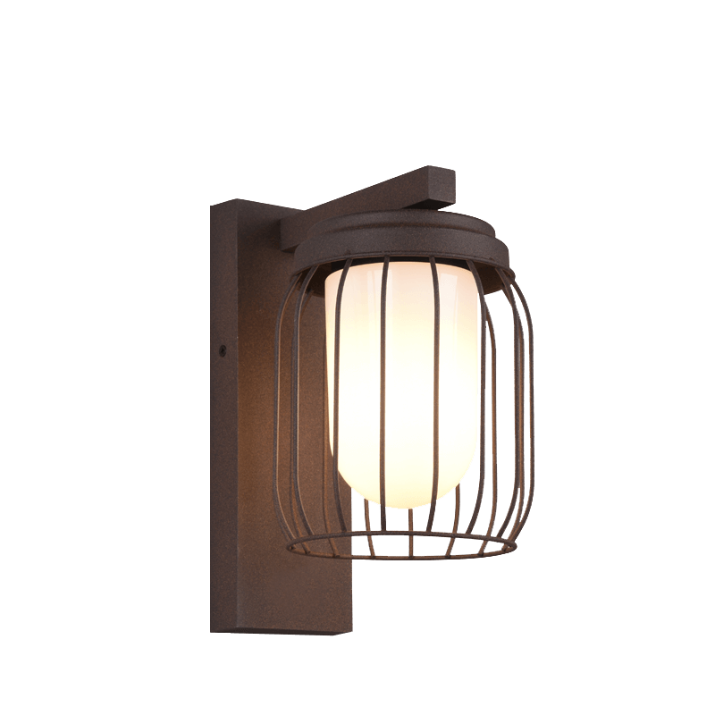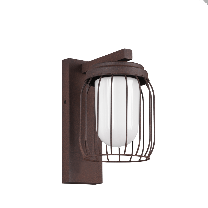El aplique Tuela presenta un color que imita al óxido y está hecho de aluminio fundido lo que lo hace particularmente atractivo en pasillos, terrazas, etc.