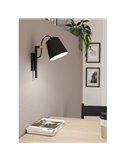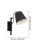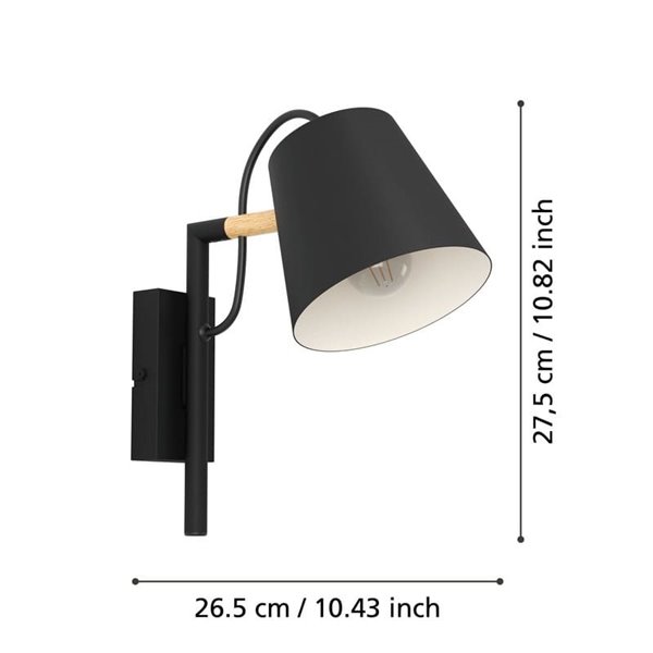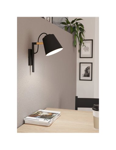El aplique de pared LACEY de Eglo es una luminaria que fusiona el diseño industrial con elementos rústicos. Su pantalla negra y detalles en madera natural aportan calidez y estilo a cualquier estancia.