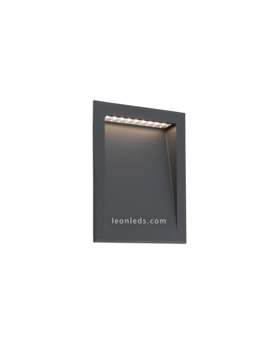 Baliza con tecnología LED incorporada de color Gris oscuro para empotrar en una pared o fachada exterior, de la marca Faro con un grado de hermeticidad de IP65, fabricado en Aluminio inyectado, y con una lente de cristal templado.