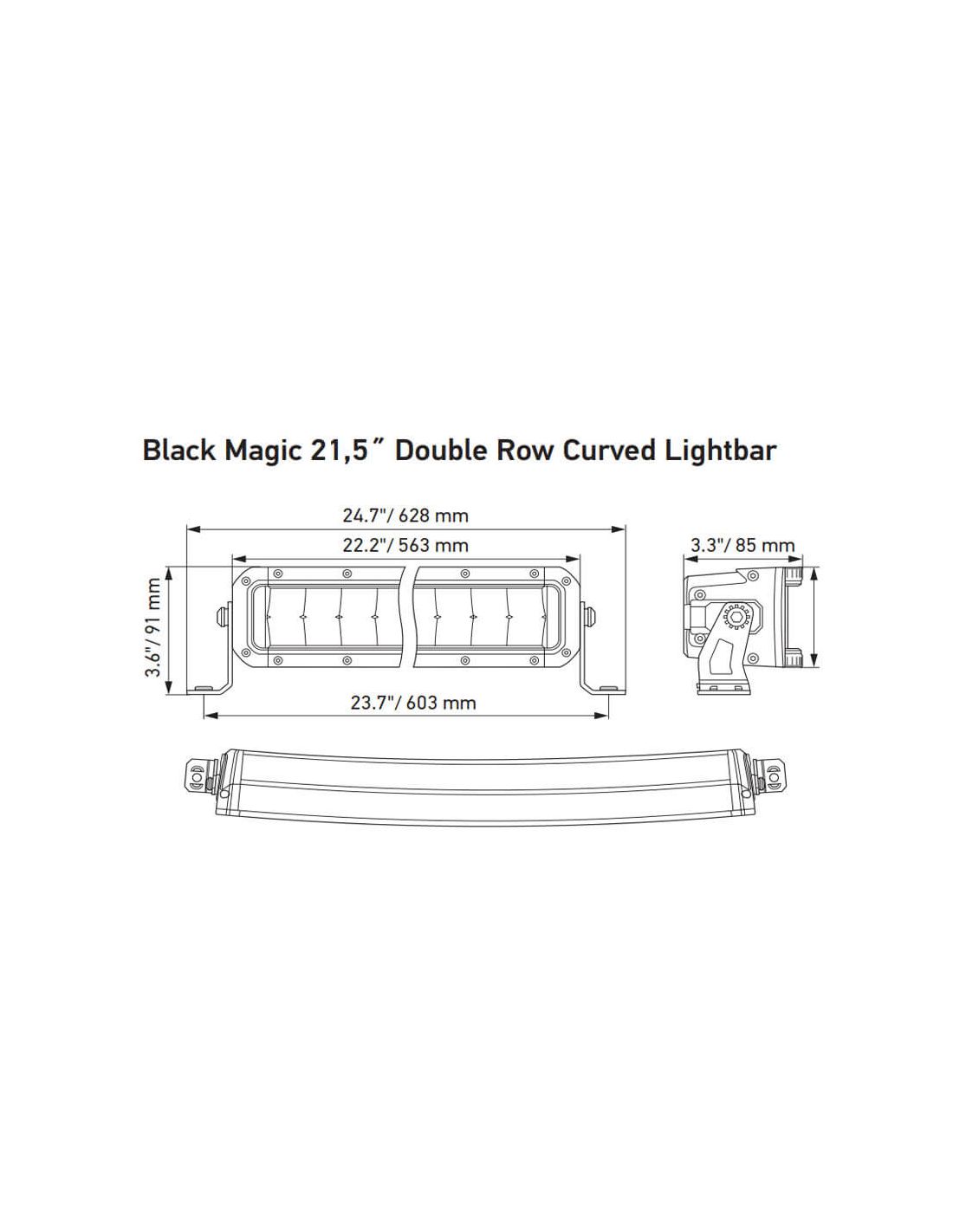 Barra LED curva de 21,5” de la serie Black Magic de Hella, esta Barra LED cuenta con una línea de 42 LEDs de alta potencia que ofrece una intensidad lumínica de 5.880Lm con un consumo de 91W, está Homologada con ECE-E149 y EMC R10 y CEPE 45. Son Válidas para 12V y para 24V y el haz de luz es combo, combina luz de largo alcance con luz de trabajo.