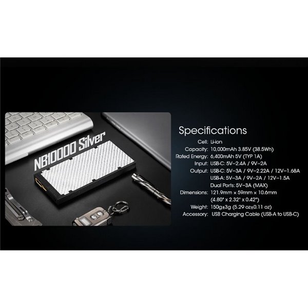 Batería externa Nitecore NB10000 Silver 10.000 mAh ultraligera y recargable USB-C
