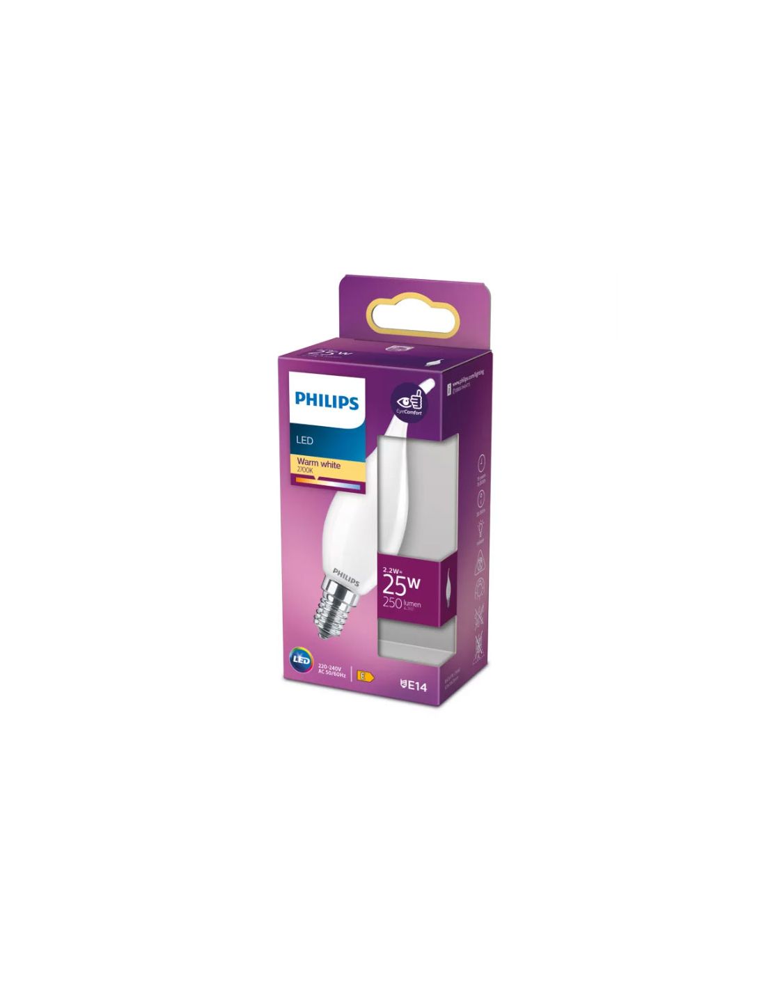 Bombilla E14 LED Vela Llama con una potencia de 2.2W equivalente a 25W de una incandescente convencional y una intensidad de 250Lm con un tono de Luz Cálido de 2700K. Tiene una vida útil de 15.000 horas y Philips ofrece una garantía de 2 años.