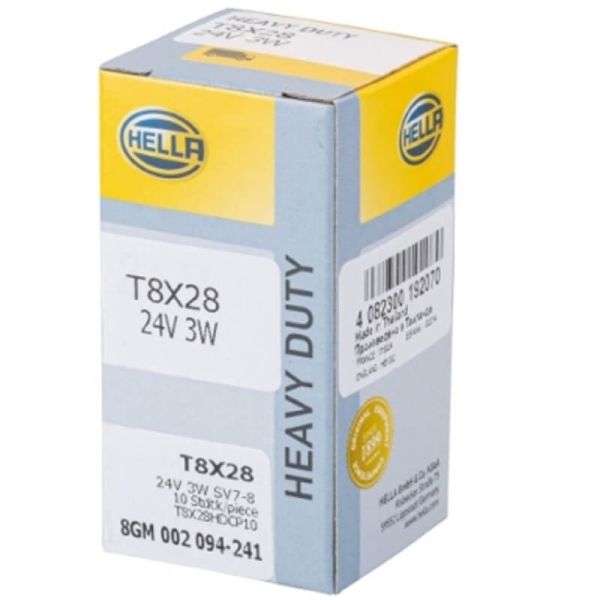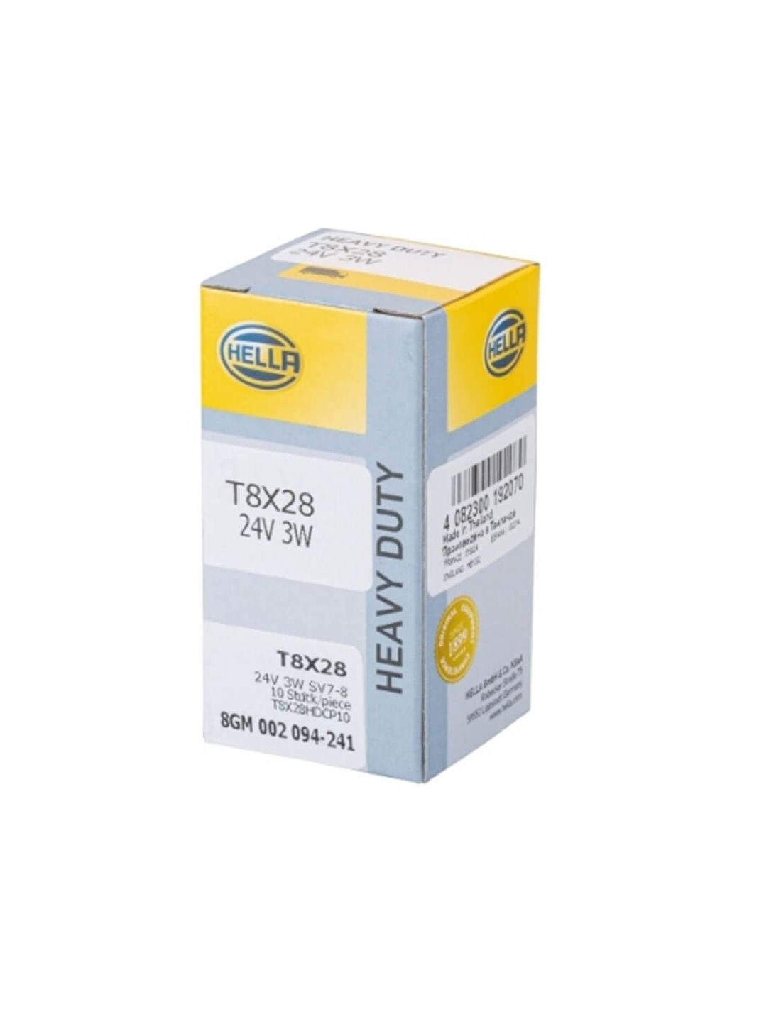 Pack de 10 bombillas halógenas HELLA 24V 3W modelo SV7-8. Diseñadas para vehículos industriales con alta resistencia a vibraciones. Calidad original para uso intensivo.