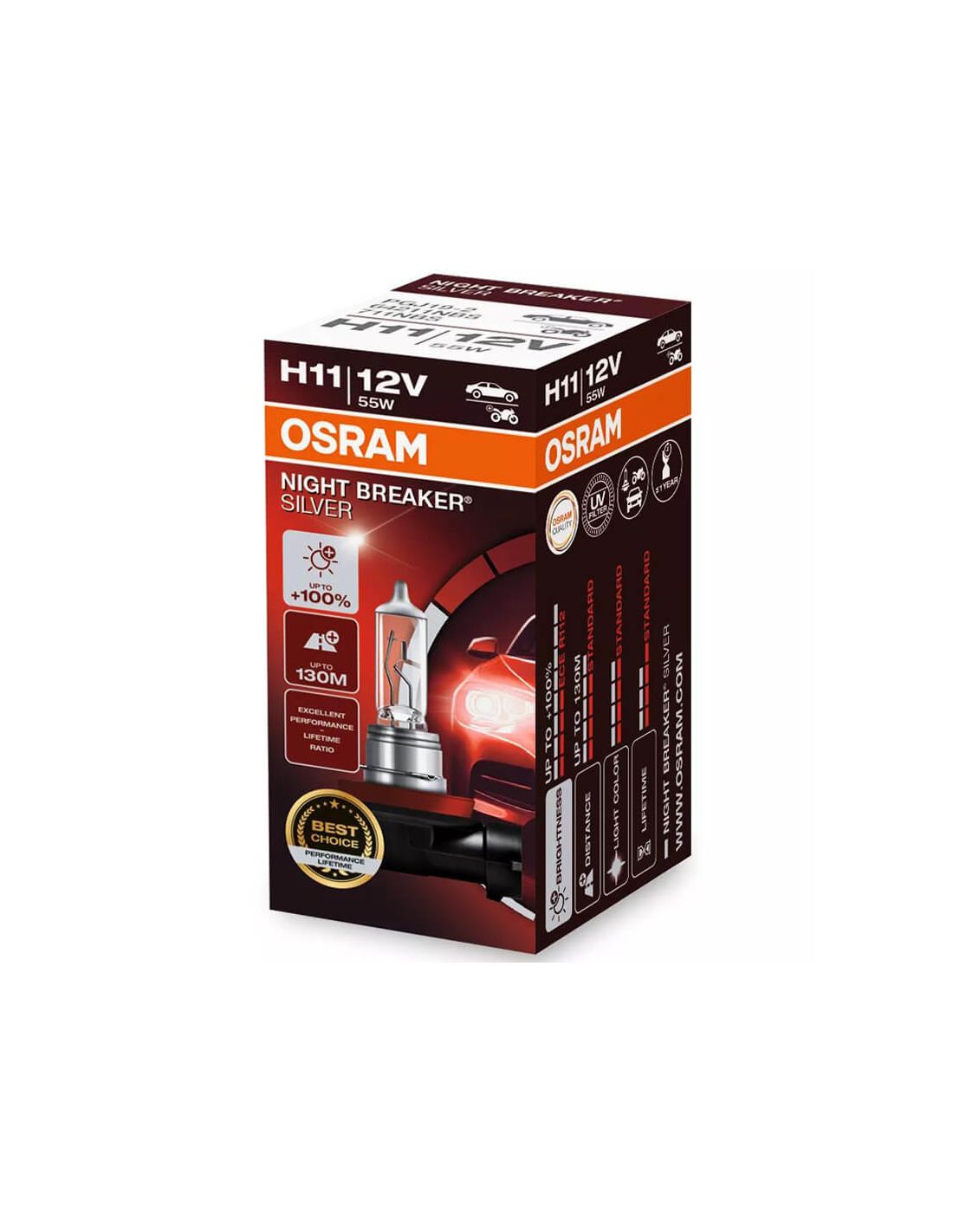 Lámpara halógena H11 OSRAM Night Breaker Silver 12V 55W con hasta un 100% más de luz y mayor vida útil. Ideal para conductores exigentes. Casquillo PGJ19-2.