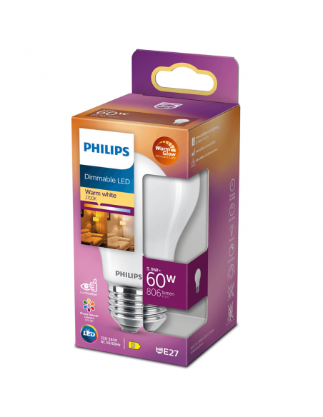 Bombilla LED con rosca E27 y formato A60 con una potencia 5,9W equivalente a 60W con una intensidad Lumínica 806Lm, nueva gama de Philips mas eficiente y mas respetuosa con el medio ambiente ya que es una Bombilla de cristal opaco. Bombilla LED Dimmable con una eficiencia energetica D.