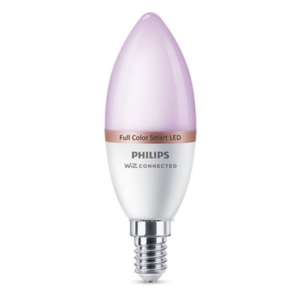 Bombilla LED inteligente formato Vela con RGB, WiZ, conexión WiFi y Bluetooth. Esta Bombilla con rosca E14 y una potencia de 4,9W equivalente a 40W de la marca Philips. Esta bombilla LED WiZ es una bombilla inteligente que funciona mediante conexión WiFi y Bluetooth permitiendo crear ambientes personalizados con 4 formatos regulación: