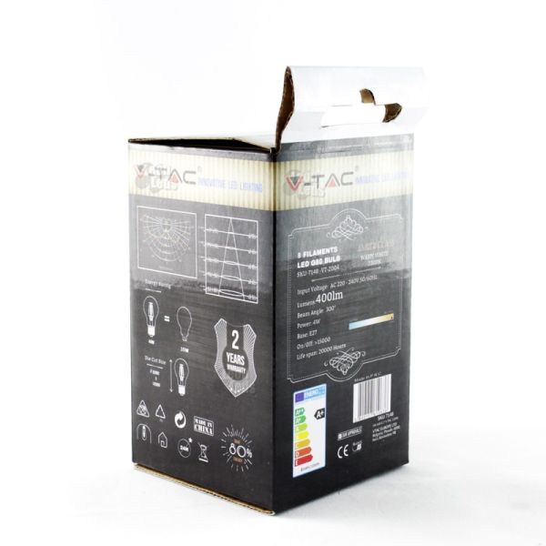 La bombilla de V-Tac Vintage E27 G80 de 4W en forma de globo es una bombilla perfecta para dar un toque rústico a tu hogar. Sustituye a bombillas convencionales de 40W emitiendo 400 lúmenes.