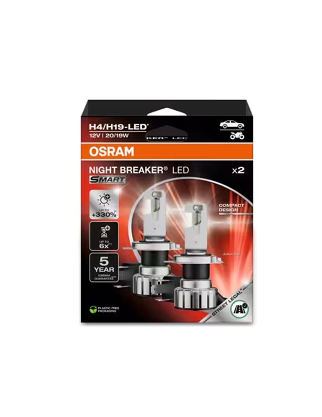 La NIGHT BREAKER LED SMART H4/H19 (ref. 64193DWNBSM-2HB) es una solución LED retrofit homologada para pasar de lámparas halógenas a LED manteniendo un enfoque legal y de seguridad (según país y lista de compatibilidad). Su diseño compacto y construcción optimizada permiten ampliar la aplicación a más vehículos, y además incorpora marcado dual para H4 LED y H19 LED.