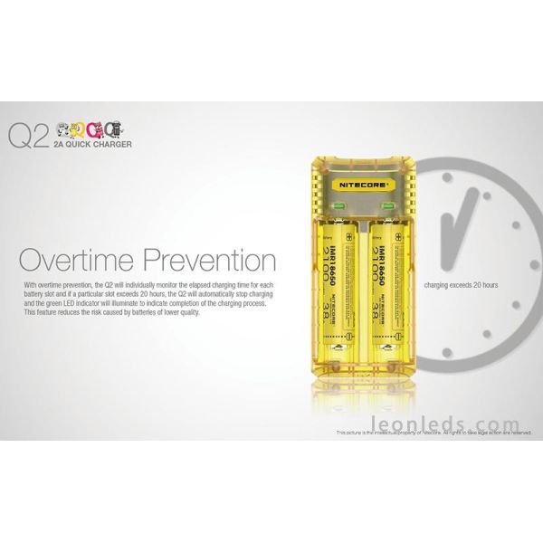 Cargador de 2 Bahías de la marca Nitecore modelo Q2 de color amarillo limón, un cargador de carga rápida, de hasta 2 Amperios, un cargador revolucionario para baterías IMR que puede cargar 2 baterías de Li-ion a la vez, de forma independiente. Un cargador apto para cargar en el mechero del coche con el adaptador correspondiente (No incluido).