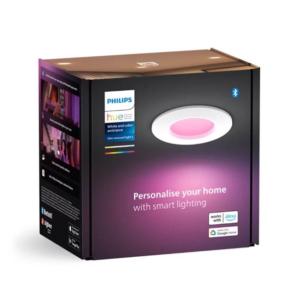El Downlight Empotrable Inteligente LED Hue White and Color Ambiance Slim de Philips Hue es la solución perfecta para quienes desean una iluminación moderna y adaptable en su hogar. Gracias a su diseño delgado, es ideal para habitaciones con techos bajos o falsos techos, permitiendo una instalación sencilla y discreta.
