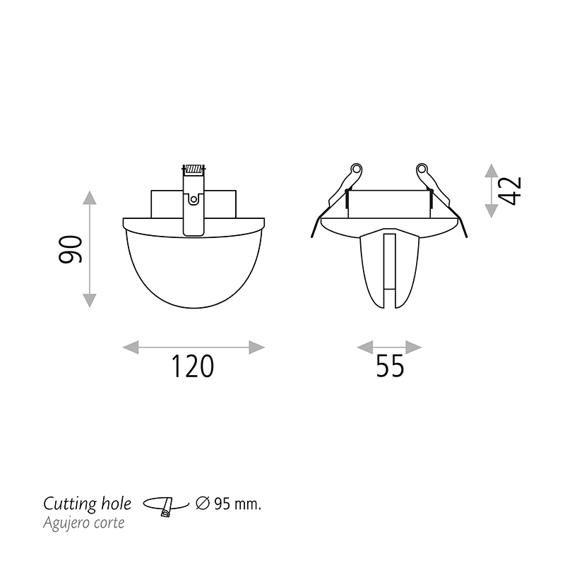 Su estructura de semicírculo suspendida del techo en aluminio y acrílico consigue una altura de 9 centímetros. El diámetro del círculo cuenta con unos 12 centímetros.