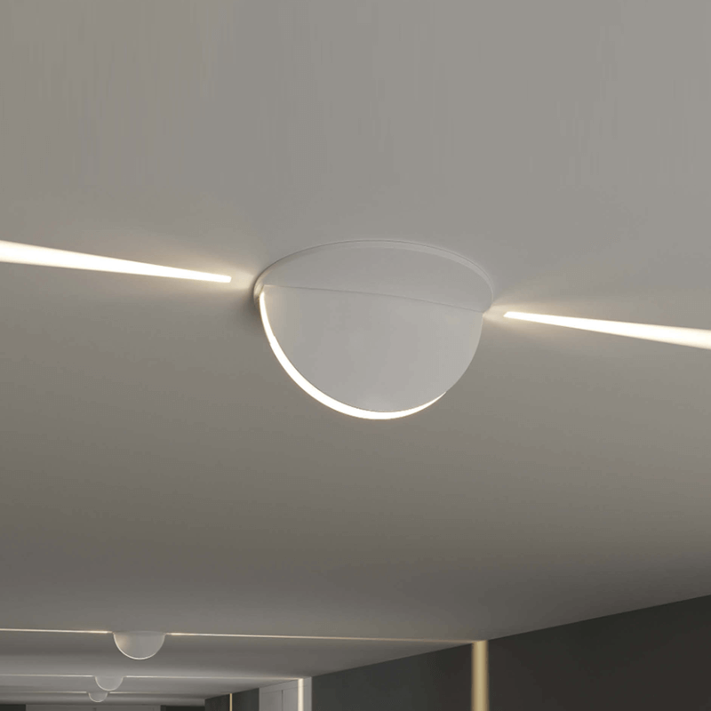 El Downlight Empotrable LED Spectra de ACB Iluminación presenta una sencilla estructura de semicírculo suspendido del techo compuesto de aluminio y acrílico. Presenta una altura de 9 centímetros.