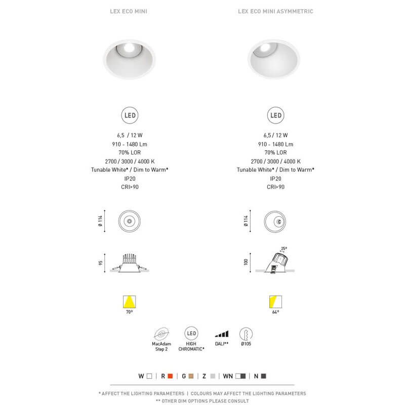 El downlight Lex Mini Asymmetric de 6,5W está disponible en un amplio abanico de 6 sorprendentes y llamativos colores y en 3 tonos de luz diferentes para que elijas entre luz muy cálida de 2700K (910 Lm), luz de color blanco cálido de 3000K (940Lm) y luz blanca natural de 4000K (960Lm).
