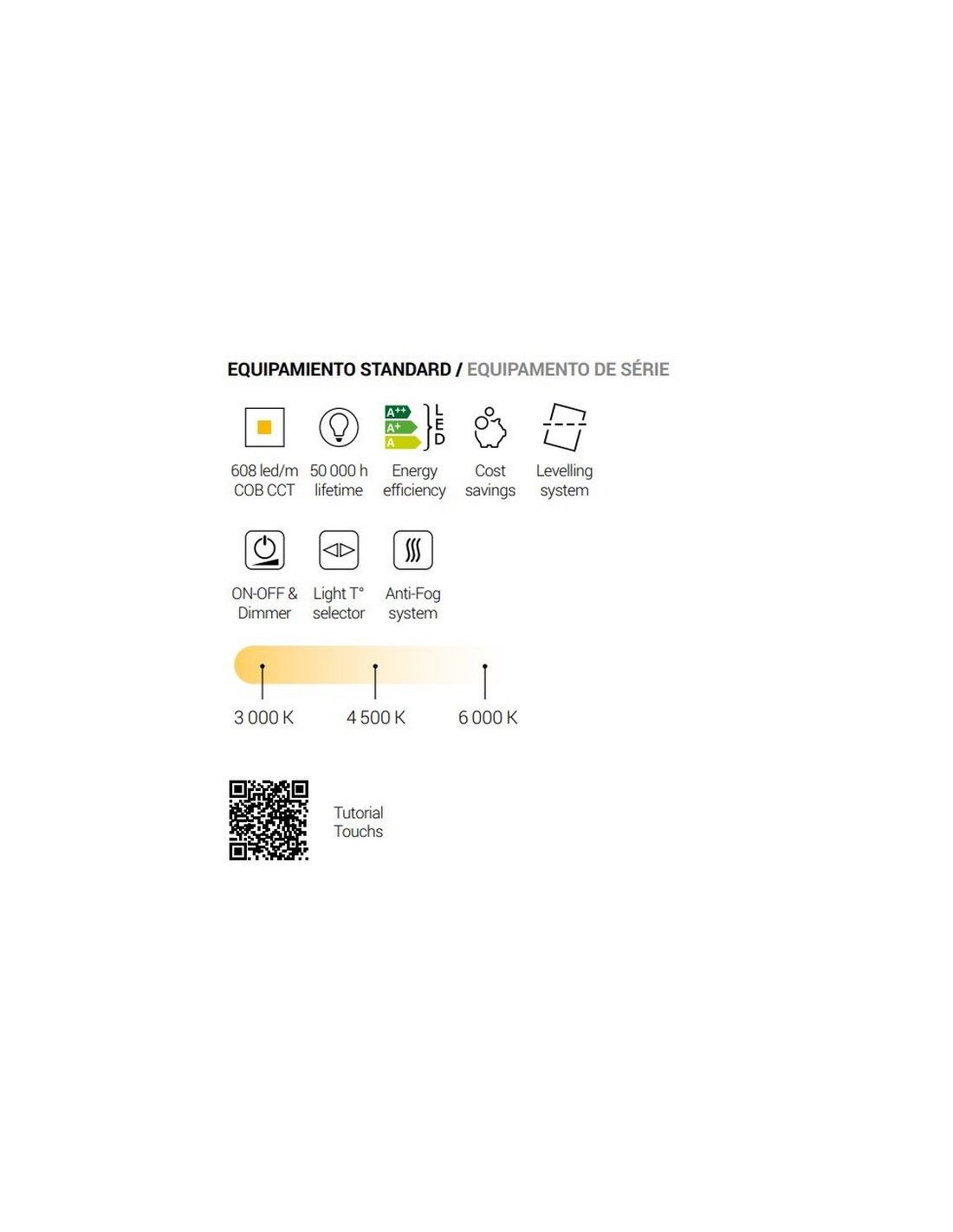 Con este touch seleccionamos la temperatura de luz deseada 3 000K, 4500 K o 6000 K (cálida, neutra o fría). Permaneciendo la opción almacenada en la memoria para el siguiente encendido.