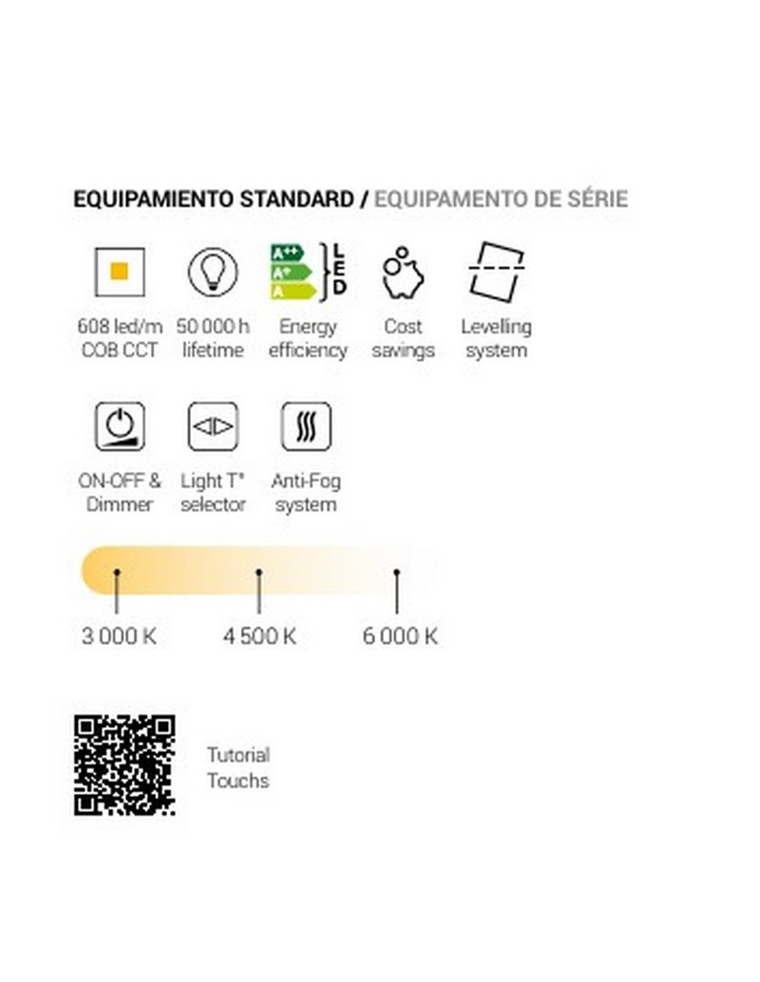 Con este touch seleccionamos la temperatura de luz deseada 3000K, 4500K o 6000K (cálida, neutra o fría). Permaneciendo la opción almacenada en la memoria para el siguiente encendido.